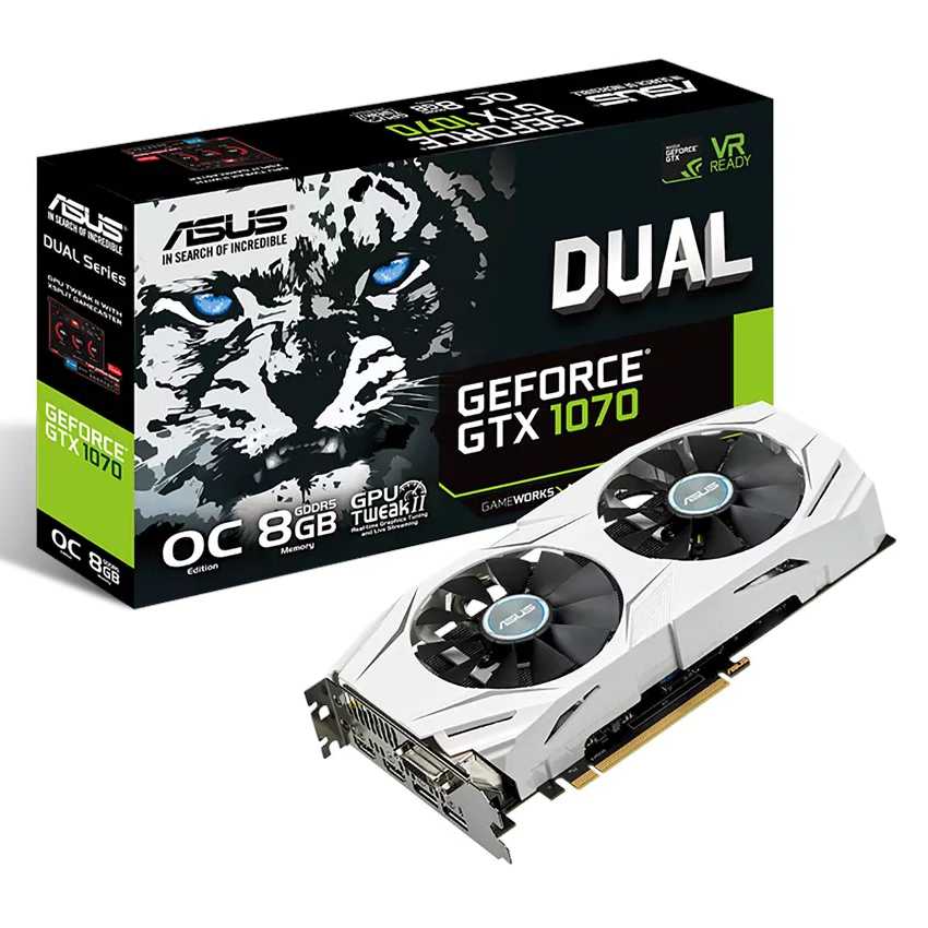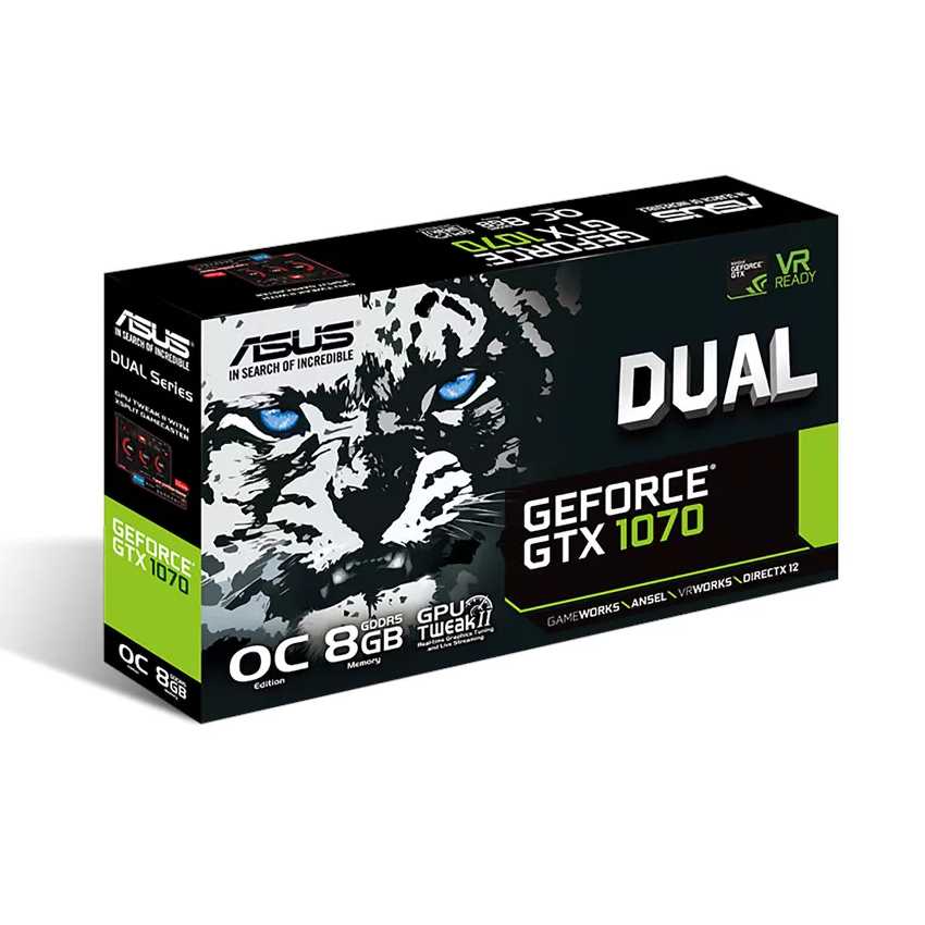 Descripción ASUS DUAL-GTX1070-O8G. Familia de procesadores de gráficos: NVIDIA, Procesador gráfico: GeForce GTX 1070, Máxima resolución: 7680 x 4320 Pixeles. Gráficos discretos memoria del adaptador: 8 GB, Tipo de memoria de adaptador gráfico: GDDR5, Ancho de datos: 256 bit. Tipo de interfaz: PCI Express x16 3.0, Versión HDMI: 2.0, Versión de DisplayPort: 1.4. Versión DirectX: 12.0, Versión Shader model: 5.0, Versión OpenGL: 4.5. Tipo de enfriamiento: Activo, Factor de forma: ATX, Color del producto: Negro, Color blanco