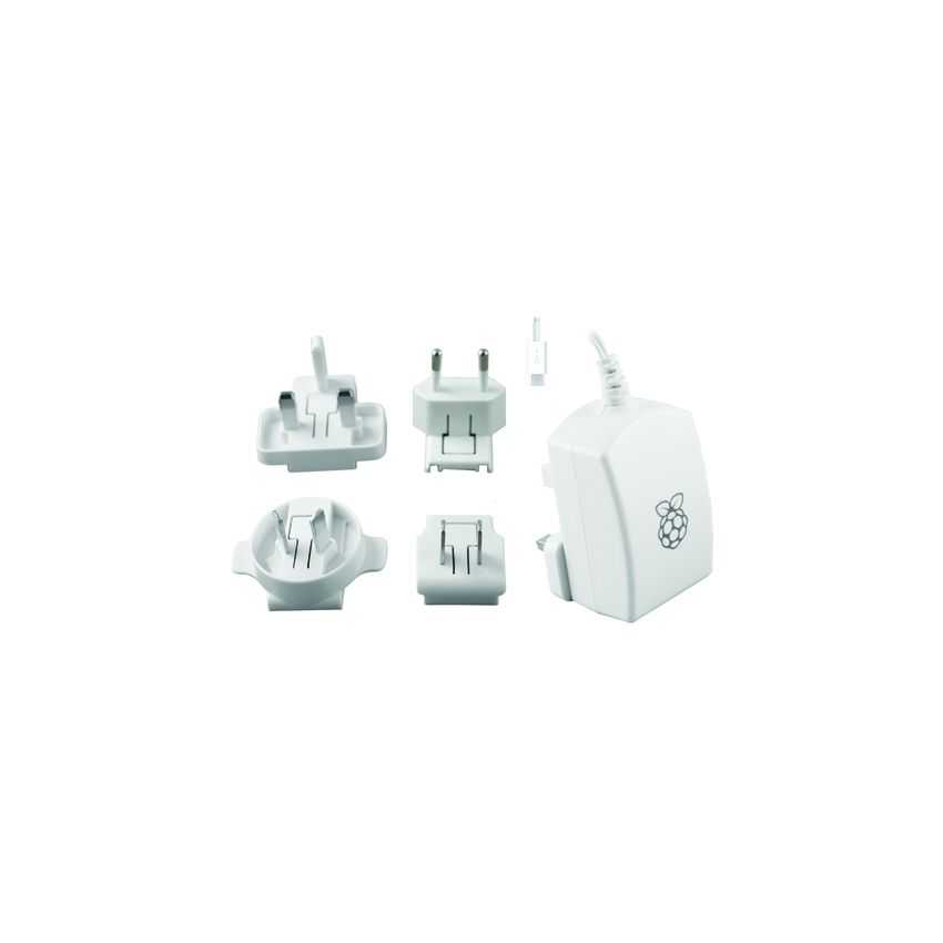 Descripción Esta fuente de alimentación universal oficial para Raspberry Pi con cable y conector MicroUSB integrados se suministra con cuatro adaptadores intercambiables que permiten su uso en todo el mundo. Adecuada para el modelo Raspberry Pi A, A+, B, B+ y la placa Compute de E/S Salida: 2 a 5 V dc Protección contra cortocircuitos, sobrecorriente y sobretensión Bajo consumo de corriente en espera Conector micro USB con cable de 1,5 m Aislamiento doble de clase II Índice de eficiencia ErP de nivel V