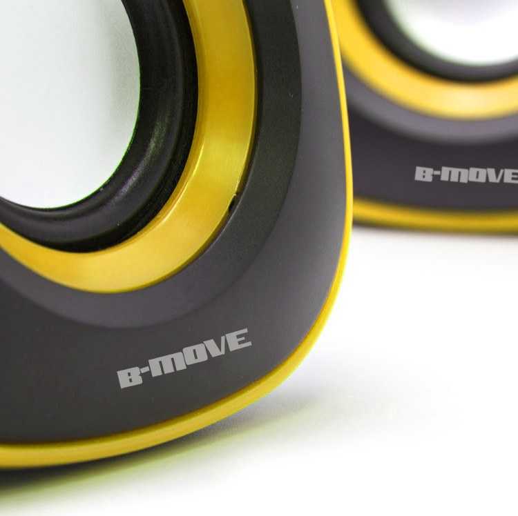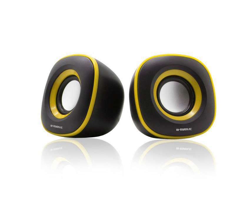 Altavoces en color negro con detalle amarillo que proporciona un sonido de alta calidad con dos satélites.