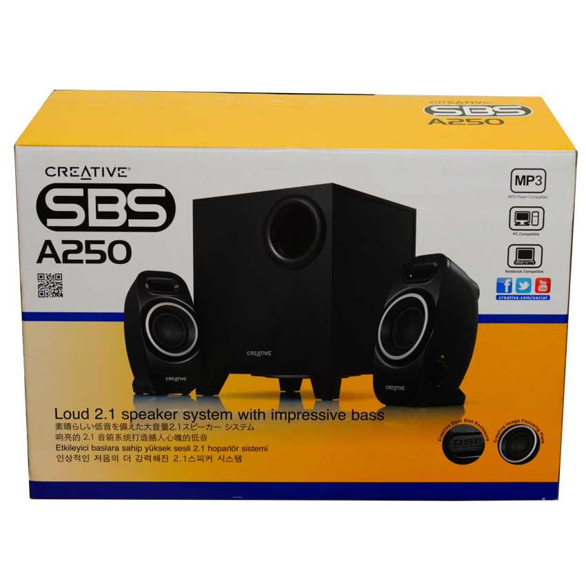 Descripción Creative Labs A250. Canales de salida de audio: 2.1, Uso recomendado: Universal. Relación señal/ruido (SNR): 75 dB. Potencia RMS de altavoces satélite: 2 W. Potencia RMS de subwoofer: 5 W. Dimensiones de bocina satelital (AxLxA): 72 x 147 x 79 mm, Dimensiones de subwoofer (AxLxA): 183 x 225 x 190 mm, Peso de subwoofer: 1,56 kg