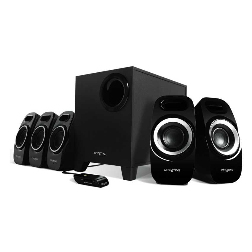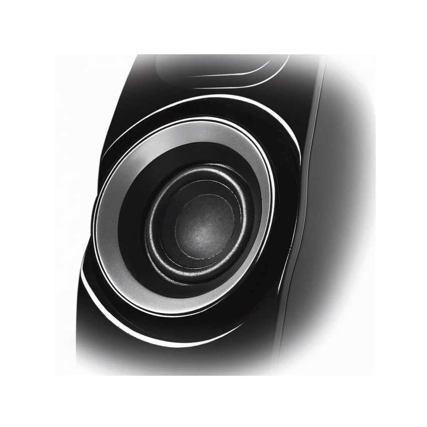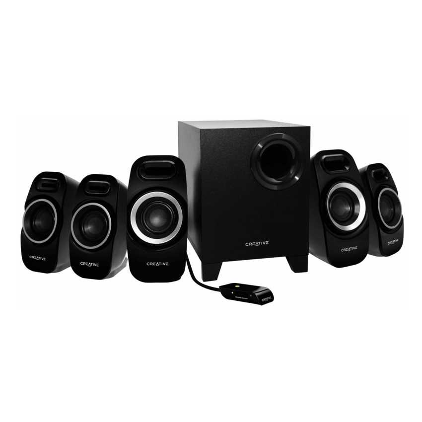 - Creative DSE (Dual Slot Enclosure) incorpora un tubo de puerto convencional y totalmente operativo en un compartimento hermético. Mejora notablemente la distribución de la frecuencia en todo el sistema, proporcionando una reproducción con más volumen y más graves medios. - La característica Creative IFP (Image Focusing Plate) mejorada incluye una parte más ancha que rodea los satélites para mejorar la dirección y organización del sonido, dando lugar a un nivel acústico óptimo más amplio mientras se mantiene la precisión tonal. - Satélites frontales característicos que imponen con su presencia, junto a satélites de posicionamiento posteriores y centrales para una colocación más discreta. - Subwoofer con puerto de graves y salida inferior con ajuste de nivel de graves. - Mando a distancia con cable integrado con botón de encendido/apagado y control de volumen.