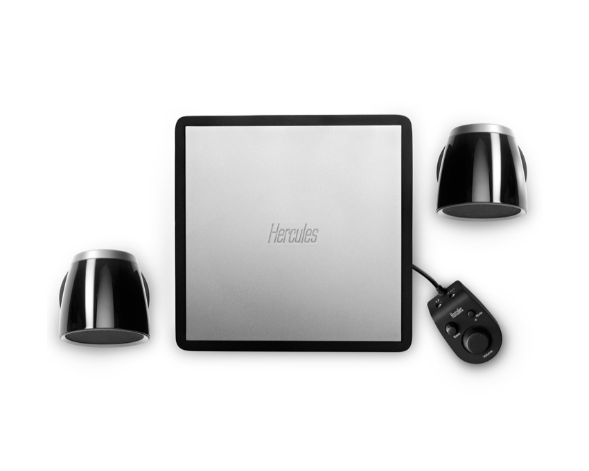 El sonido unido al estilo Sonido equilibrado, muy impresionante con un diseño limpio y original. Aspecto y diseño inspirados en el Hercules XPS 101, el aclamado sistema de altavoces de alto nivel. 82 W de pico de potencia. Subwoofer de madera que mejora la respuesta de los bajos, y buenas conexiones entre el subwoofer y los satélites. El subwoofer incorpora un acabado armonioso, que le convierte en un producto orientado al diseño. 2 satélites elegantes con una base de pedestal: los satélites cuentan con un acabado lacado y goma en la base. Drivers de satélites de banda ancha apantallados magnéticamente. Mando a distancia con cable que cuenta con rueda de volumen maestro, rueda de control de bajos, botón de silencio, entrada de línea (para conectar cualquier reproductor de MP3) y conector de auriculares estéreo. Rueda de volumen maestro grande, para mayor facilidad de uso.