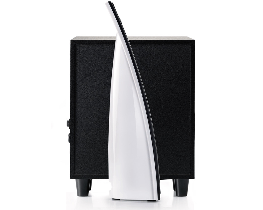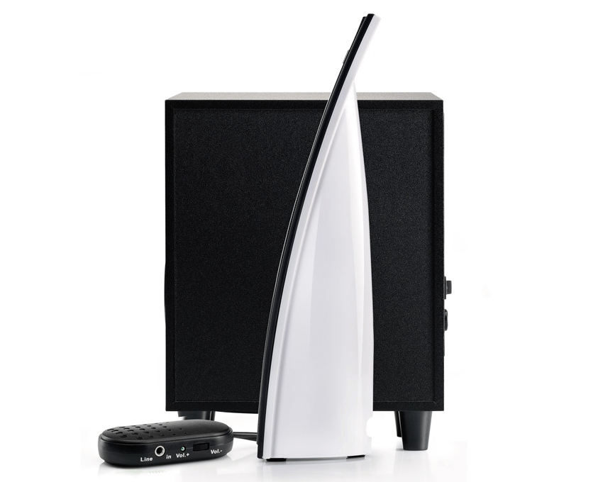 Sonido de alta calidad, combinado con una atractiva forma arqueada. Sonido de alta calidad, combinado con una atractiva forma arqueada. Diseño exclusivo. Los satélites cuentan con un acabado blanco lacado. Rejilla protectora metálica lacada en negro para los drivers de los altavoces. Altavoces de banda ancha, apantallados magnéticamente. Subwoofer de madera (con control de volumen). Mando a distancia con cable y control de volumen, y entrada de línea para conectar cualquier reproductor de MP3. Dimensiones del satélite: 23,8 x 6,5 x 6,5 cm. Cable de conexión a la fuente de audio.