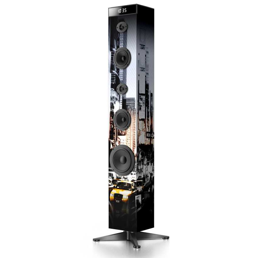 Especificaciones Canales de salida de audio: 2.1 Número de altavoces: 1 Número de dispositivos: 5 Tweeter: Si Altavoz de sub-graves: Si Potencia estimada RMS: 80 W Tecnología de conectividad: Inalámbrico y alámbrico Interfaz: Bluetooth/3.5mm/USB Bluetooth: Si Versión de Bluetooth: 2.1+EDR Comunicación de Campo Cercano (NFC): Si Cantidad de puertos USB 2.0: 1 Entrada auxiliar: Si Puerto de carga USB: Si Auriculares: 3,5 mm Diseño: Puesto Color del producto: Multi Material de la carcasa: Madera Control de volumen: Digital Pantalla incorporada: Si Indicadores LED: Si Uso recomendado: Universal Operado remotamente: Si Interruptor de encendido/apagado integrado: Si Radio FM: Si Conectar y usar (Plug and Play): Si Alimentación: Corriente alterna Voltaje de entrada de adaptador AC: 100 - 240 V Frecuencia de adaptador AC: 50/60 Hz Cantidad: 1 Ancho: 24,8 cm Profundidad: 24,8 cm Altura: 101,2 cm Peso: 5,35 kg Ancho del paquete: 19,2 cm Profundidad del paquete: 23,2 cm Altura del paquete: 105,1 cm Peso del paquete: 5,8 kg Cables incluidos: AUX, Audio (3.5mm), RCA Mando a distancia: Si
