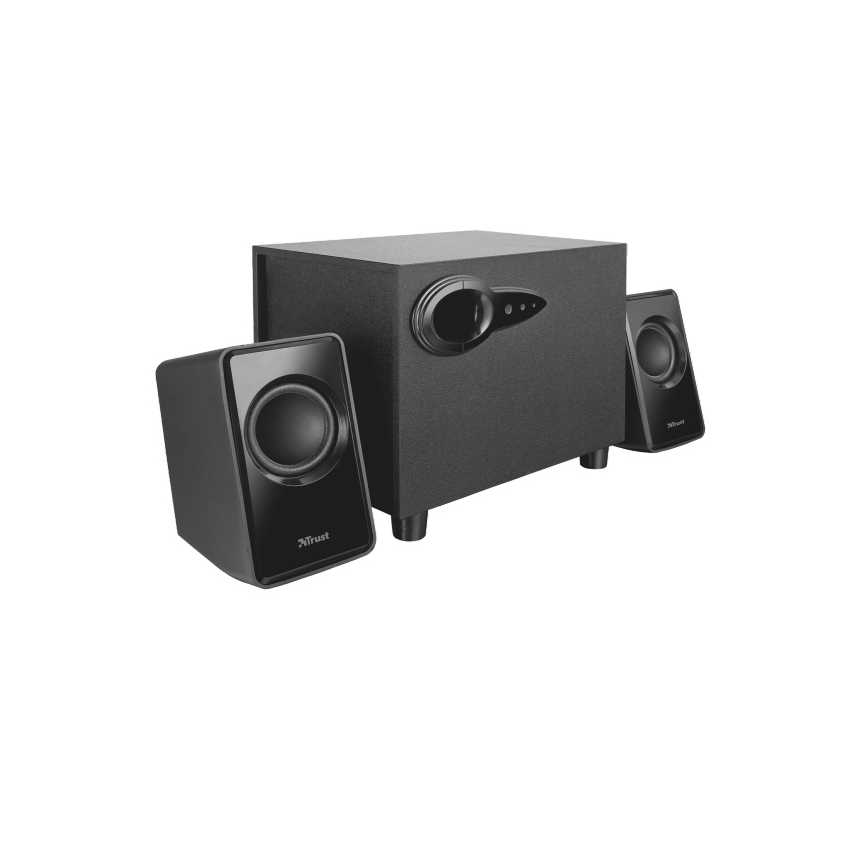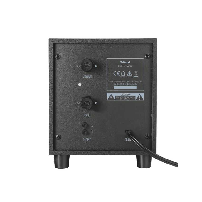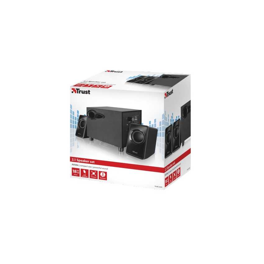 Descripción Trust Avora 2.1. Canales de salida de audio: 2.1, Potencia estimada RMS: 9W, Uso recomendado: PC. Tipo de bocina satelital: De 2 vías, Potencia RMS de altavoces satélite: 9W, Potencia pico de altavoz satélite: 18W. Tipo de subwoofer: Activo. Fuente de energía: USB. Cables incluidos: USB