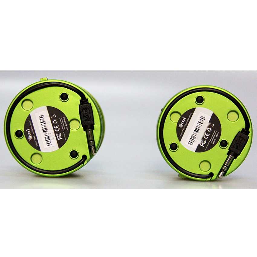 Especificaciones Uso recomendado: Otro Ubicación de bocina: Portátil Caja de altavoz: cerrado Número de dispositivos: 2 Tweeter: Si Potencia estimada RMS: 4 W Rango de frecuencia: 60 - 20000 Hz Relación señal/ruido (SNR): 91 Db THD, distorción armónica total: 1 % Color del producto: Verde Ecualizador: N Magnéticamente protegida: Si Tiempo continuo de reproducción de audio: 18 h Tecnología de conectividad: Alámbrico Material de la carcasa: De plástico Ancho: 82 mm Diámetro: 54 mm Peso: 0.16 kg Alimentación: USB Autonomía: 18 h Tiempo de recarga de la batería: 2.5 h Voltaje de entrada DC: 5 V Batería recargable: Si Manual de usuario: Si