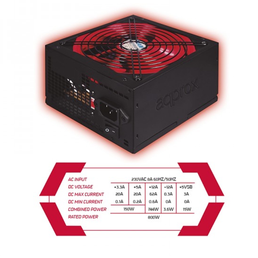 • Gama Gaming • Potencia nominal: 800W • Voltaje de entrada AC: 230V • Frecuencia de entrada AC: 50 Hz • Diámetro de ventilador: 14 cm • Ubicación de ventilador: Superior • Tipo de enfriamiento: Activo • Alimentador de energía para tarjeta madre: 20+4 pin ATX • Factor de forma: ATX • Utilizar con: PC • Versión ATX: 2.3 • Color del producto: Negro