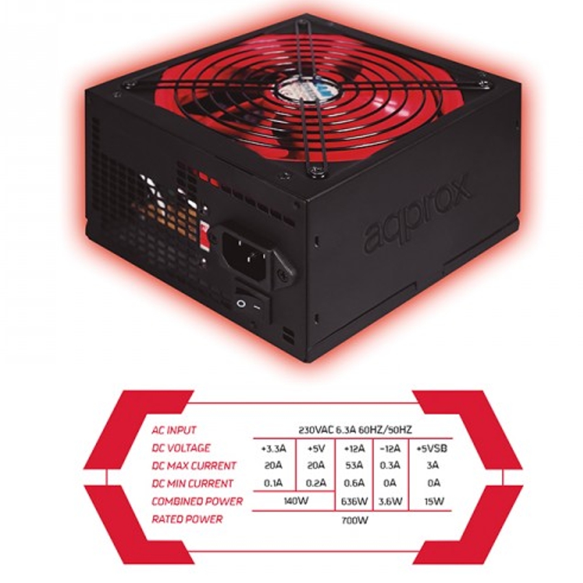 • Acabados Gaming con marcaje especial, ventilador rojo y materiales de primera calidad. • Máxima potencia 700W para que tu equipo soporte todas tus necesidades. • Incorpora PFC activo, protección contra sobretensión/subtensión, cortocircuito y sobrecarga.