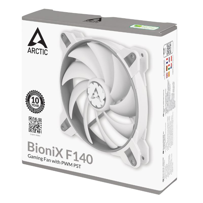 - Marca: Artic - Producto: Ventilador caja bionix F140 - Rendimiento: - Flujo de aire: 104 CFM (176 m³/h) a 1.800 RPM - Nivel de ruido: 0,6 Sone (a 1.800 RPM) - Características eléctricas: - Voltaje típico: 12 V DC - Longitud del cable: 400 mm - Longitud del cable PST secundario: 50 mm - Conexión: - Placa madre: +12V DC - Señal de control PWM