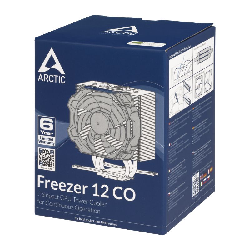 Descripción ARCTIC Freezer 12 CO. Adecuado para: Procesador, Tipo: Enfriador, Sockets de procesador soportados: Zócalo AM4, LGA 1151 (Zócalo H4), LGA 2011-v3 (Socket R). Color del producto: Aluminio, Gris, Material: Aluminio. Voltaje: 12 V, Intensidad nominal: 0,16 A. Ancho: 90 mm, Profundidad: 108 mm, Altura: 130 mm