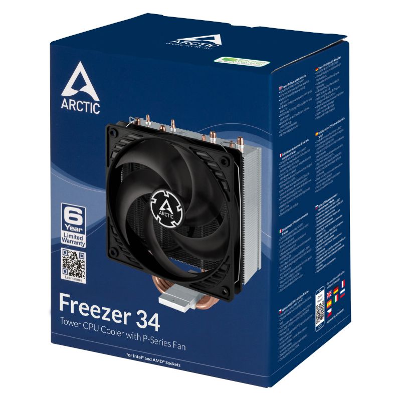 Descripción ARCTIC Freezer 34. Adecuado para: Procesador, Tipo: Enfriador, Sockets de procesador soportados: LGA 1150 (Zócalo H3), LGA 1151 (Zócalo H4), LGA 1155 (Socket H2), LGA 1156 (Socket H), LGA 1366.... Color del producto: Aluminio, Negro. Voltaje: 12 V, Intensidad nominal: 0,08 A. Ancho: 86 mm, Profundidad: 124 mm, Altura: 157 mm. Tipo de embalaje: Caja