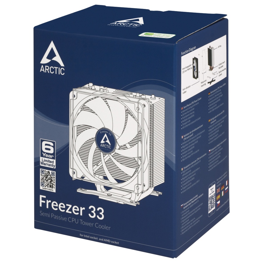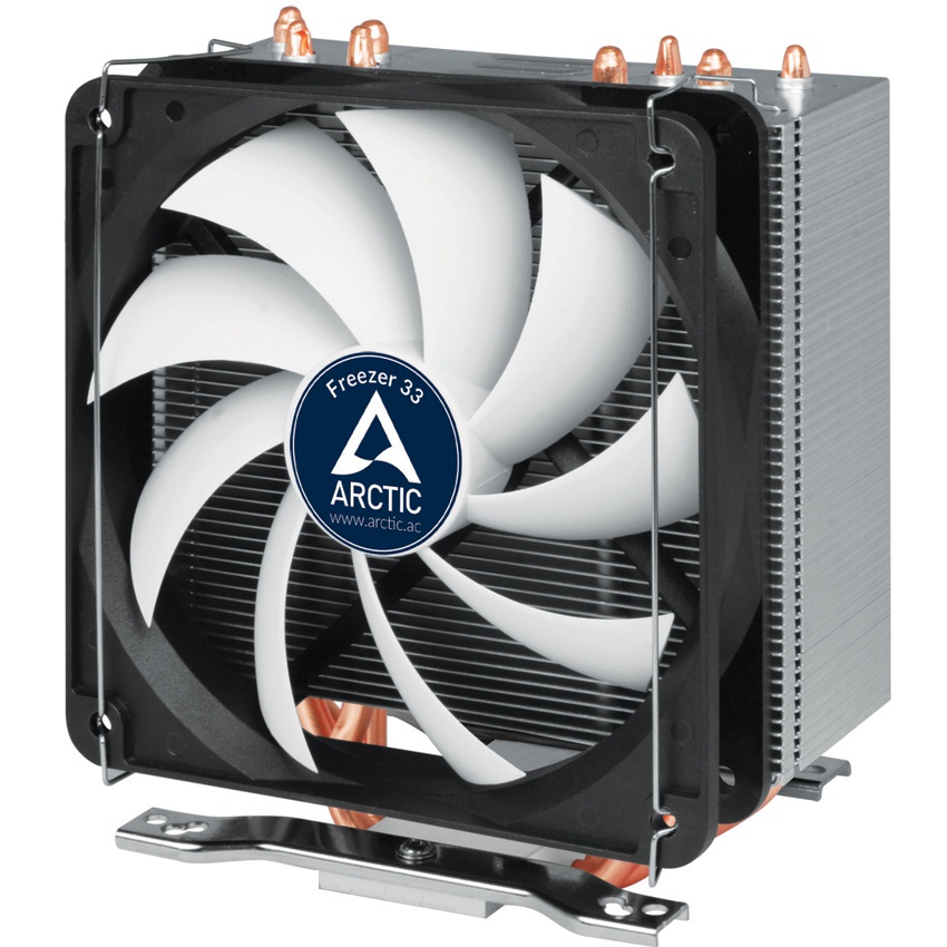 Descripción ARCTIC Freezer 33. Adecuado para: Procesador, Tipo: Enfriador, Diámetro de ventilador: 12 cm. Color del producto: Aluminio, Negro, Color blanco, Materiales: Aluminio, Acero. Intensidad nominal: 0,2 A, Consumo energético: 1 W. Ancho: 123 mm, Profundidad: 95 mm, Altura: 150 mm