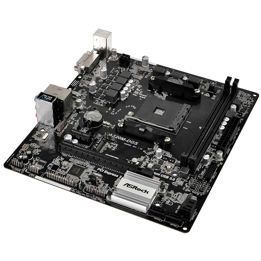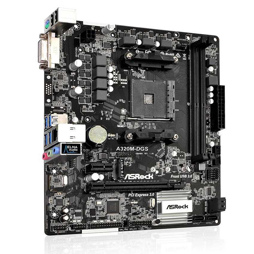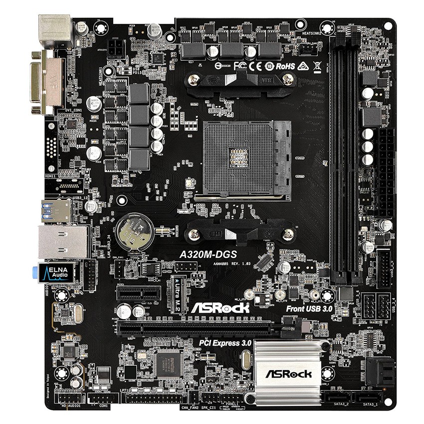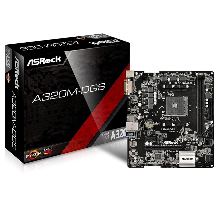 Descripción Asrock A320M-DGS. tipos de memoria compatibles: DDR4-SDRAM, Tipo de ranuras de memoria: DIMM, Velocidades de reloj de memoria soportadas: 2133,2400,2667,2933,3200 MHz. Familia de procesador: AMD, Procesador compatible: AMD A,Ryzen, Socket de procesador: Socket AM4. Controlador LAN: Realtek RTL8111GR, Tipo de interfaz ethernet: Gigabit Ethernet. Componente para: PC, Familia de componentes de tarjeta madre: AMD, Circuito integrado de tarjeta madre: AMD A320. Máxima resolución: 1920 x 1080 Pixeles