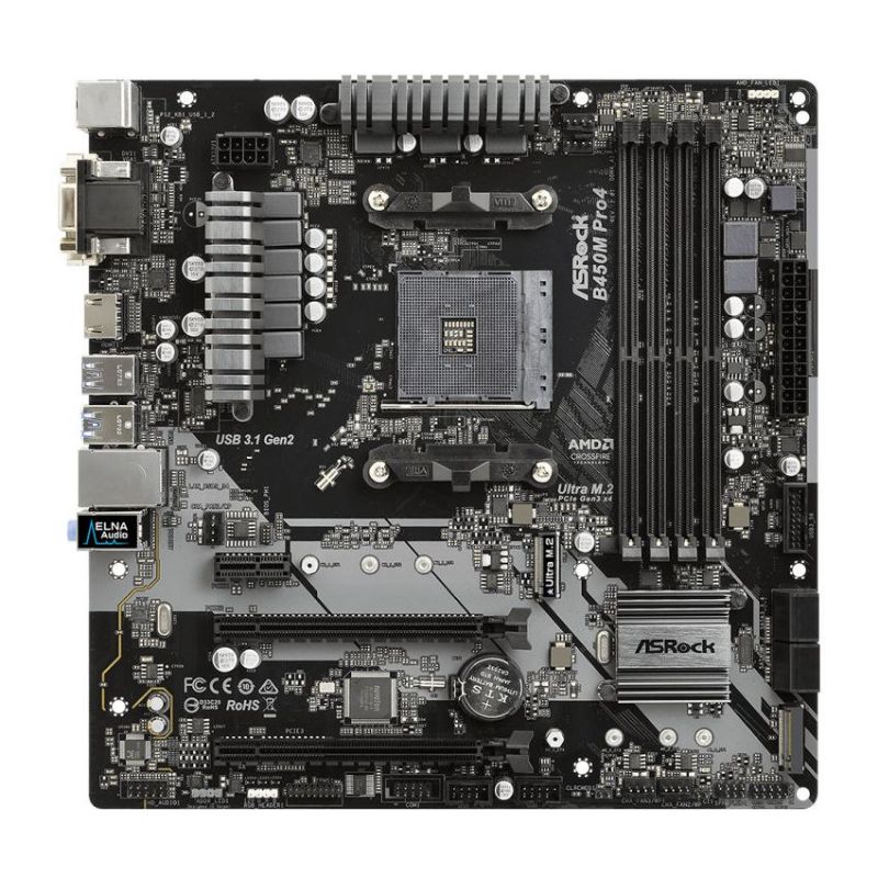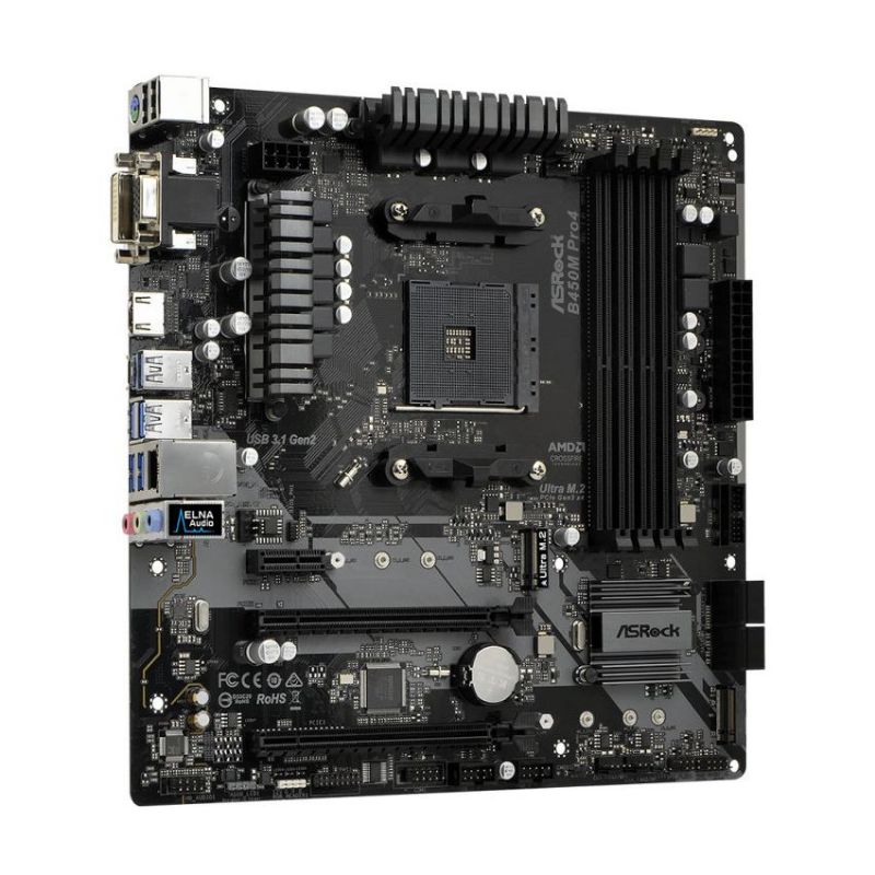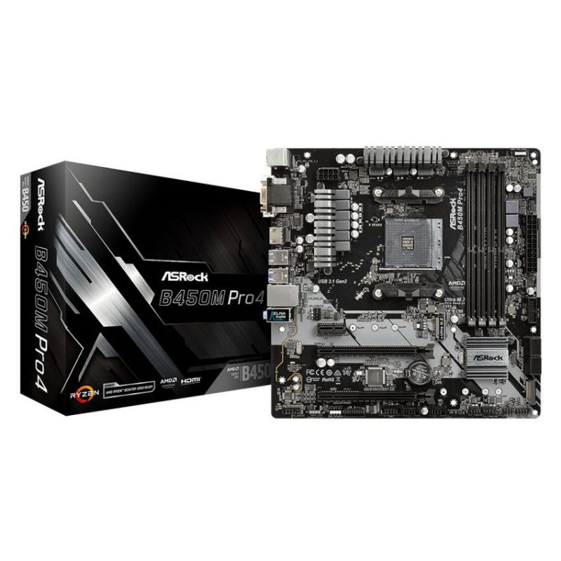Descripción Asrock B450M Pro4. Fabricante de procesador: AMD, Socket de procesador: Zócalo AM4, Procesador compatible: AMD Athlon, AMD Ryzen 3, 2nd Generation AMD Ryzen™ 3, AMD Ryzen 3 3rd Gen, AMD Ryzen 5, 2nd.... tipos de memoria compatibles: DDR4-SDRAM, Tipo de ranuras de memoria: DIMM, Velocidades de reloj de memoria soportadas: 2133,2400,2667,2933 MHz. Graphics chipset: AMD, Máxima resolución: 4096 x 2160 Pixeles. Tipo de interfaz ethernet: Gigabit Ethernet, Controlador LAN: Realtek RTL8111H. Componente para: PC, Factor de forma: micro ATX, Familia del chipset: AMD