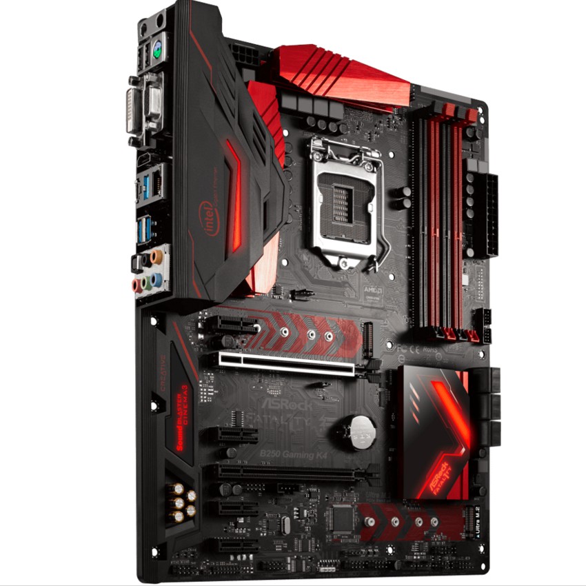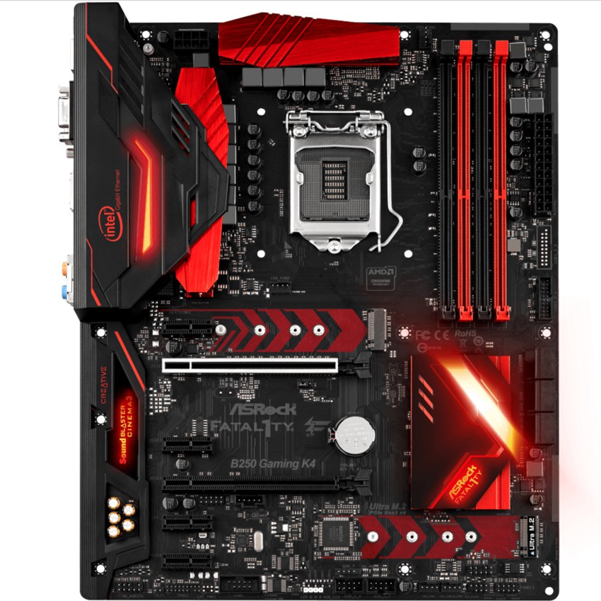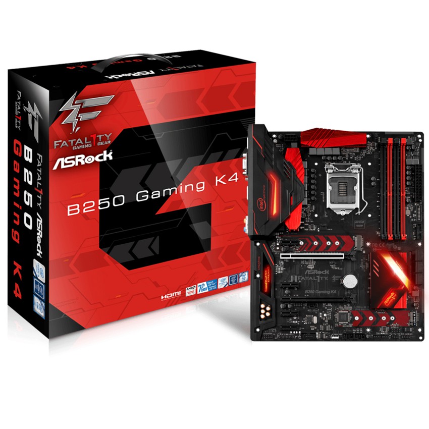 Descripción Asrock Fatal1ty B250 Gaming K4. tipos de memoria compatibles: DDR4-SDRAM, Tipo de ranuras de memoria: DIMM, Velocidades de reloj de memoria soportadas: 2133,2400 MHz. Familia de procesador: Intel, Procesador compatible: Celeron,Core i3,Core i5,Core i7,Pentium, Socket de procesador: LGA1151. Interfaces de disco de almacenamiento soportados: M.2, Serial ATA III. Conector USB: USB Type-A,USB Type-C. Controlador LAN: Intel I219-V, Tipo de interfaz ethernet: Gigabit Ethernet