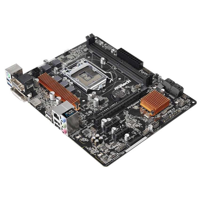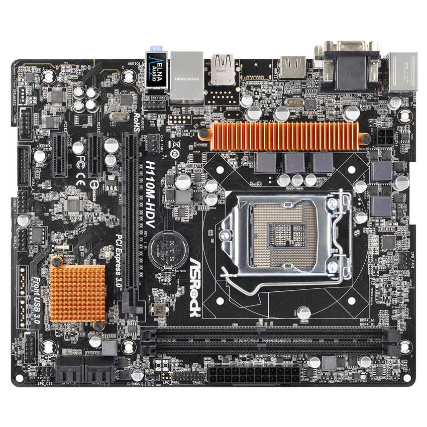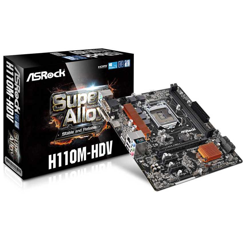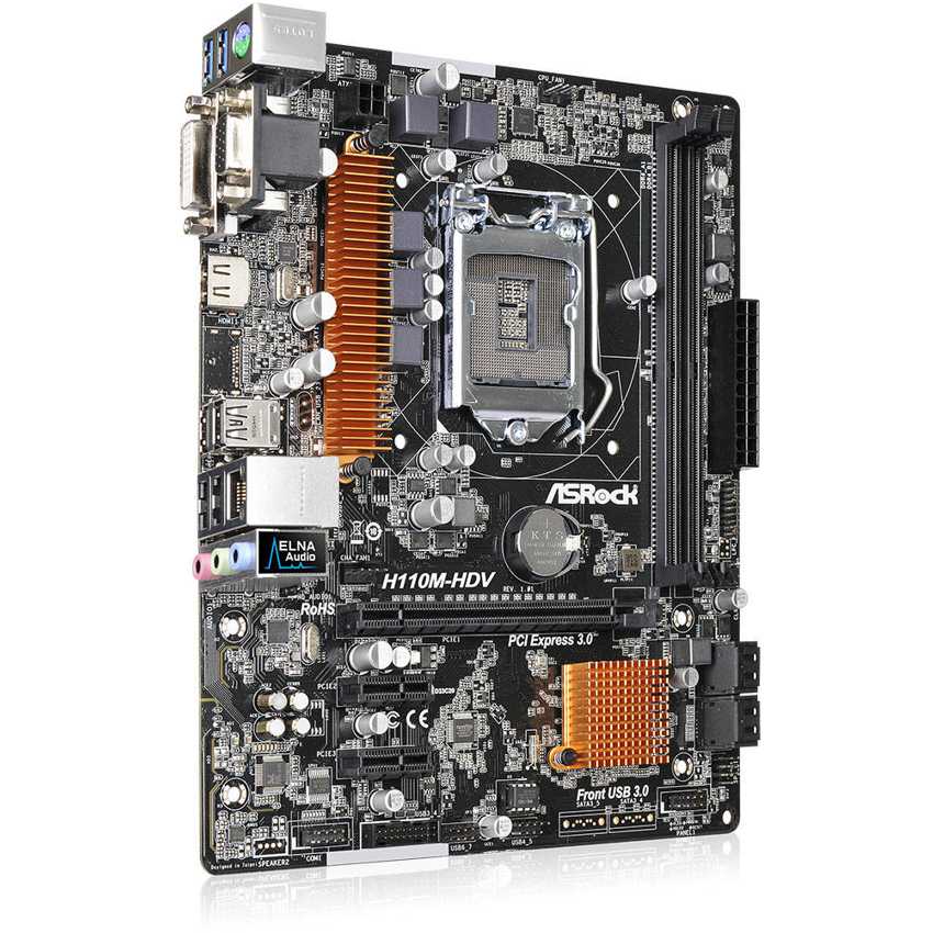 Descripción Asrock H110M-HDV. tipos de memoria compatibles: DDR4-SDRAM, Tipo de ranuras de memoria: DIMM, Canales de memoria: Dual. Familia de procesador: Intel, Procesador compatible: Celeron, Core i3, Core i5, Core i7, Pentium, Socket de procesador: LGA1151. Interfaces de unidad de disco duro soportadas: Serial ATA III. Controlador LAN: Realtek RTL8111E, Tipo de interfaz ethernet: Gigabit Ethernet. Componente para: PC, Familia de componentes de tarjeta madre: Intel, Circuito integrado de tarjeta madre: Intel H110