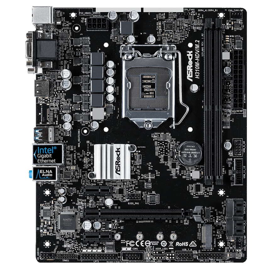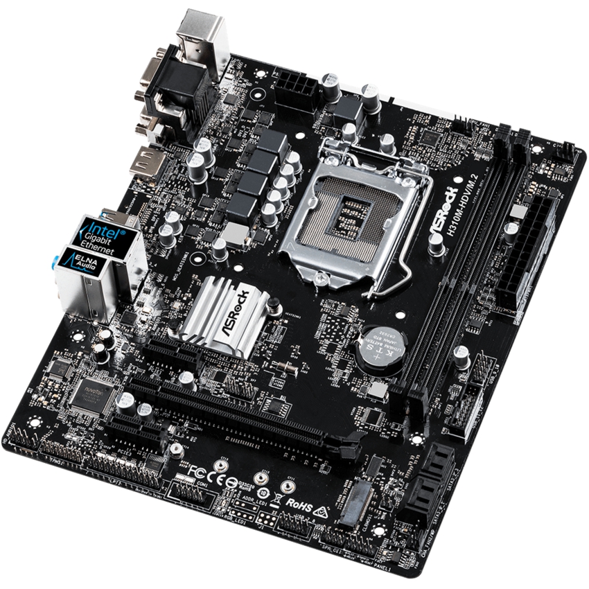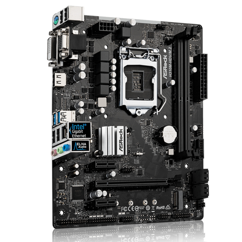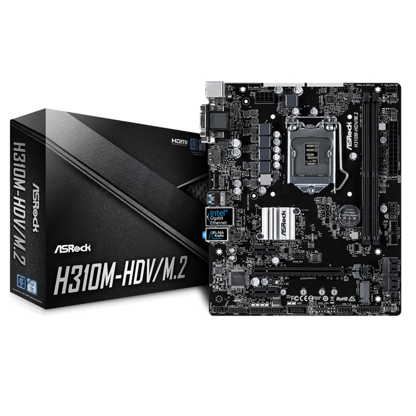 Descripción Asrock H310M-HDV. tipos de memoria compatibles: DDR4-SDRAM, Tipo de ranuras de memoria: DIMM, Velocidades de reloj de memoria soportadas: 2133,2400,2666 MHz. Fabricante de procesador: Intel, Procesador compatible: Intel Core i3,Intel Core i5,Intel Core i7, Socket de procesador: LGA 1151 (Socket H4). Interfaces de disco de almacenamiento soportados: Serial ATA III. Controlador LAN: Realtek RTL8111H, Tipo de interfaz ethernet: Gigabit Ethernet. Componente para: PC, Familia de componentes de tarjeta madre: Intel, Circuito integrado de tarjeta madre: Intel H310