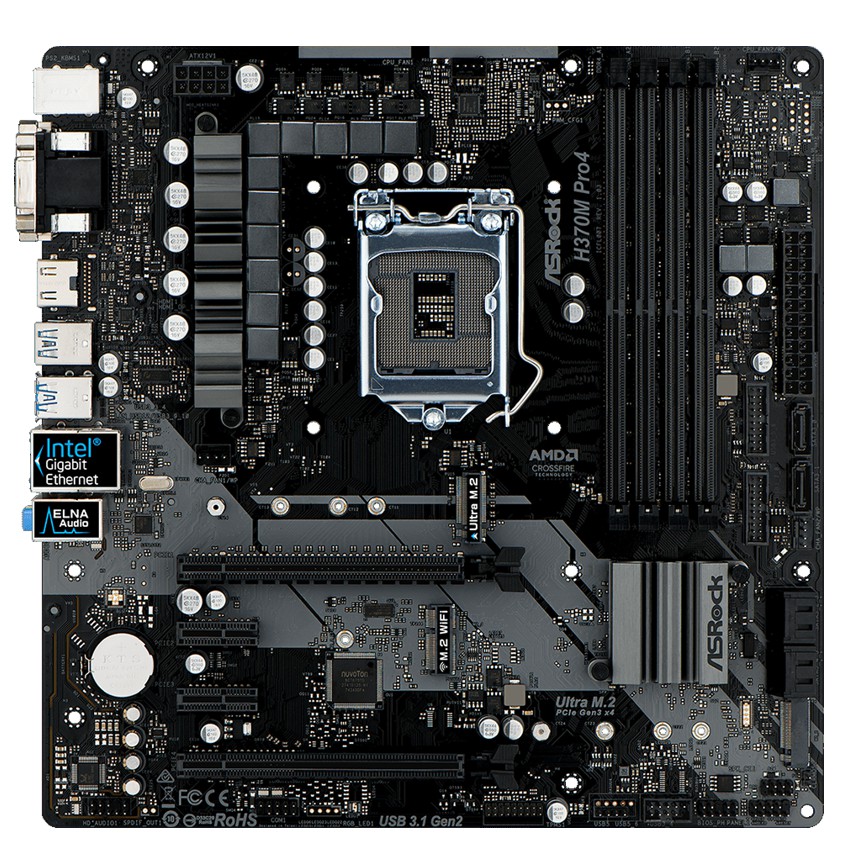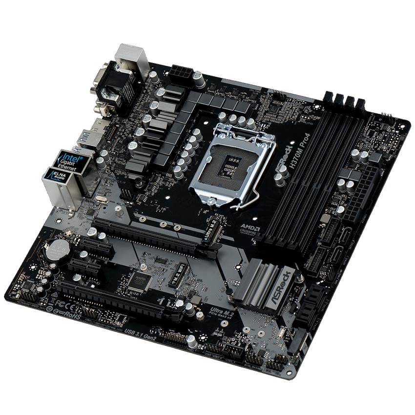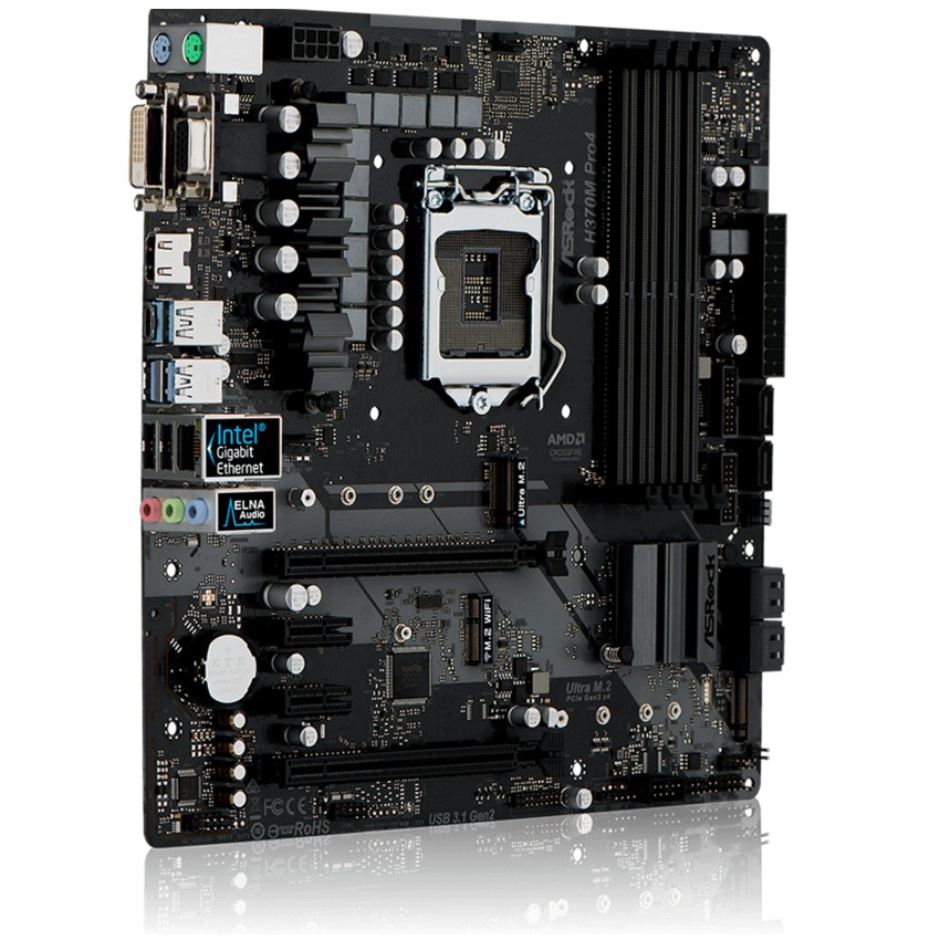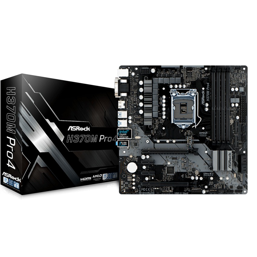 Descripción Asrock H370M Pro4. tipos de memoria compatibles: DDR4-SDRAM, Tipo de ranuras de memoria: DIMM, Velocidades de reloj de memoria soportadas: 2133,2400,2666 MHz. Fabricante de procesador: Intel, Procesador compatible: Intel Core i3,Intel Core i5,Intel Core i7, Socket de procesador: LGA 1151 (Socket H4). Interfaces de disco de almacenamiento soportados: M.2, Serial ATA III. Controlador LAN: Intel I219-V, Tipo de interfaz ethernet: Gigabit Ethernet. Componente para: PC, Familia de componentes de tarjeta madre: Intel, Circuito integrado de tarjeta madre: Intel H370