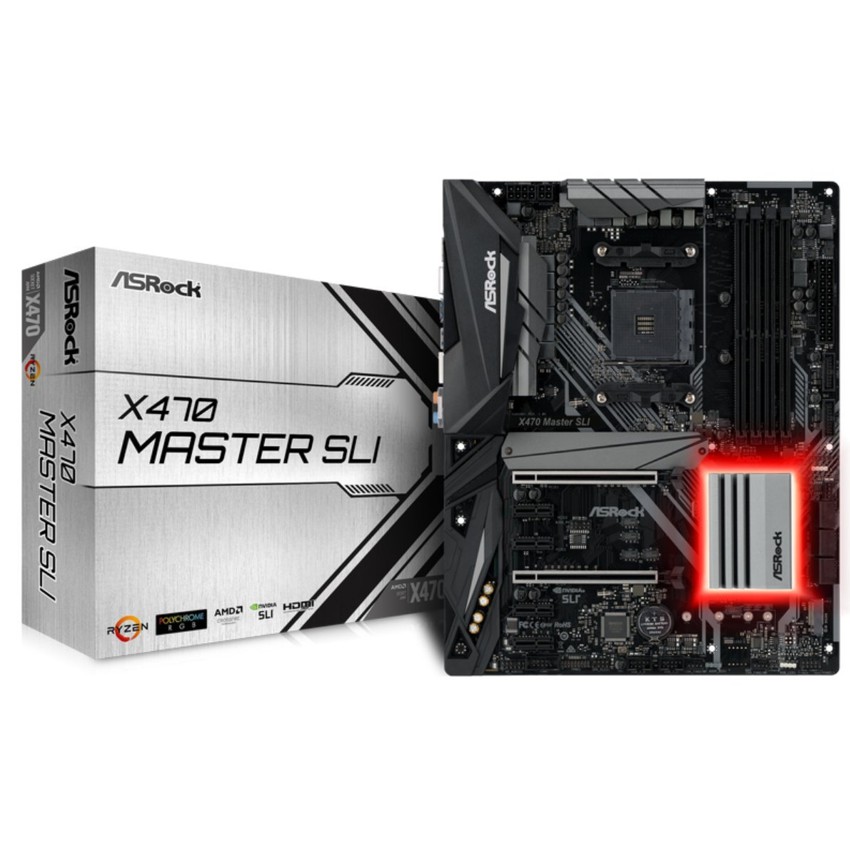 Descripción Asrock X470 Master SLI. tipos de memoria compatibles: DDR4-SDRAM, Tipo de ranuras de memoria: DIMM, Velocidades de reloj de memoria soportadas: 2133,2400,2667,2933,3200,3466 MHz. Fabricante de procesador: AMD, Socket de procesador: Socket AM4. Controlador LAN: Intel I211-AT, Tipo de interfaz ethernet: Gigabit Ethernet. Componente para: PC, Familia de componentes de tarjeta madre: AMD, Circuito integrado de tarjeta madre: AMD X470. Memoria máxima de adaptador de gráficos: 2048 MB, Soporte para proceso paralelo: CrossFireX,Quad-GPU CrossFireX,Quad-GPU SLI,SLI, Graphics chipset: AMD