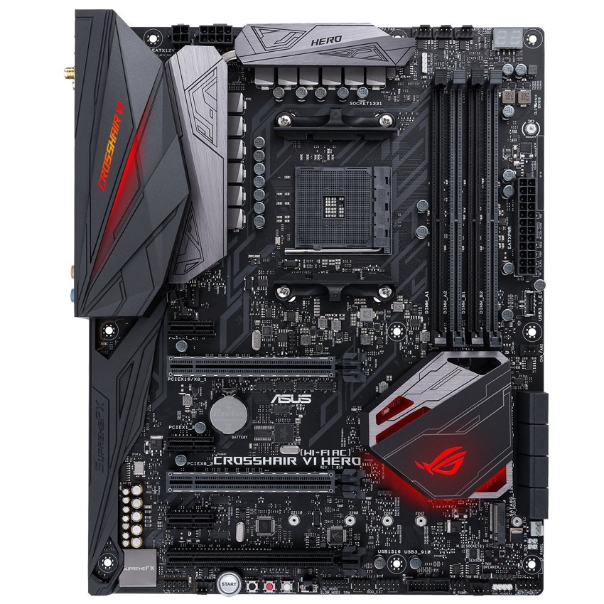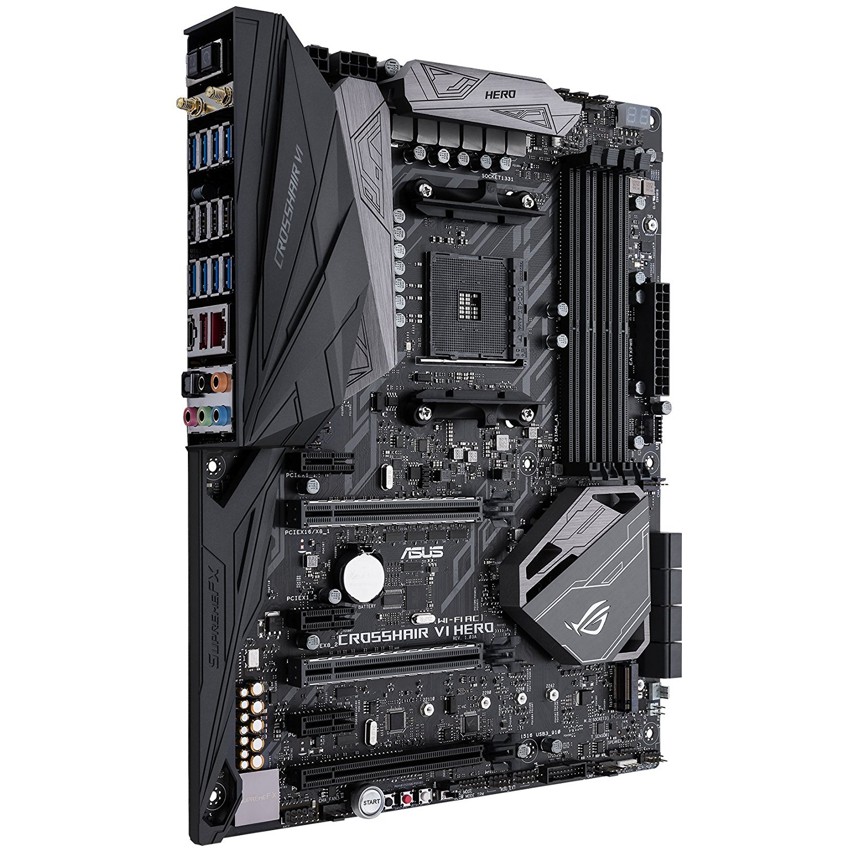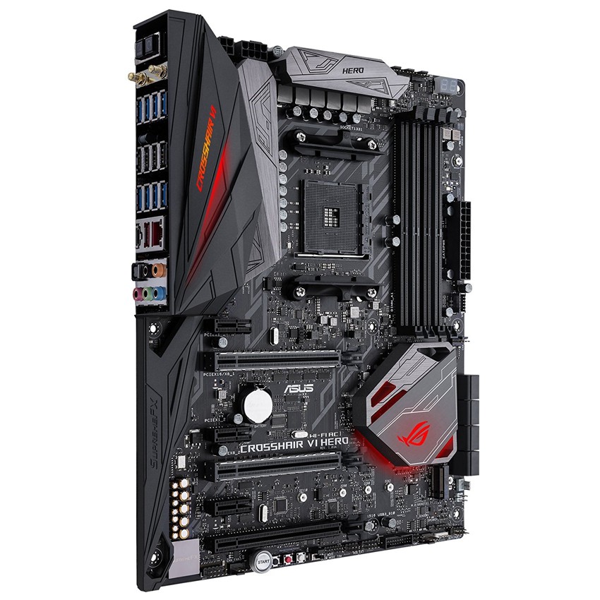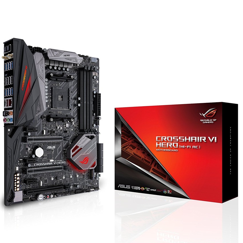 Descripción ASUS ROG CROSSHAIR VI HERO (WI-FI AC). tipos de memoria compatibles: DDR4-SDRAM, Tipo de ranuras de memoria: DIMM, Velocidades de reloj de memoria soportadas: 2133,2400,2666,3200 MHz. Familia de procesador: AMD, Procesador compatible: AMD A,Athlon,Ryzen, Socket de procesador: Socket AM4. Controlador LAN: Intel I211-AT, Tipo de interfaz ethernet: Gigabit Ethernet, Wi-Fi estándares: IEEE 802.11a,IEEE 802.11ac,IEEE 802.11b,IEEE 802.11g,IEEE 802.11n. Componente para: PC, Familia de componentes de tarjeta madre: AMD, Circuito integrado de tarjeta madre: AMD X370. Soporte para proceso paralelo: 2-Way SLI,CrossFireX
