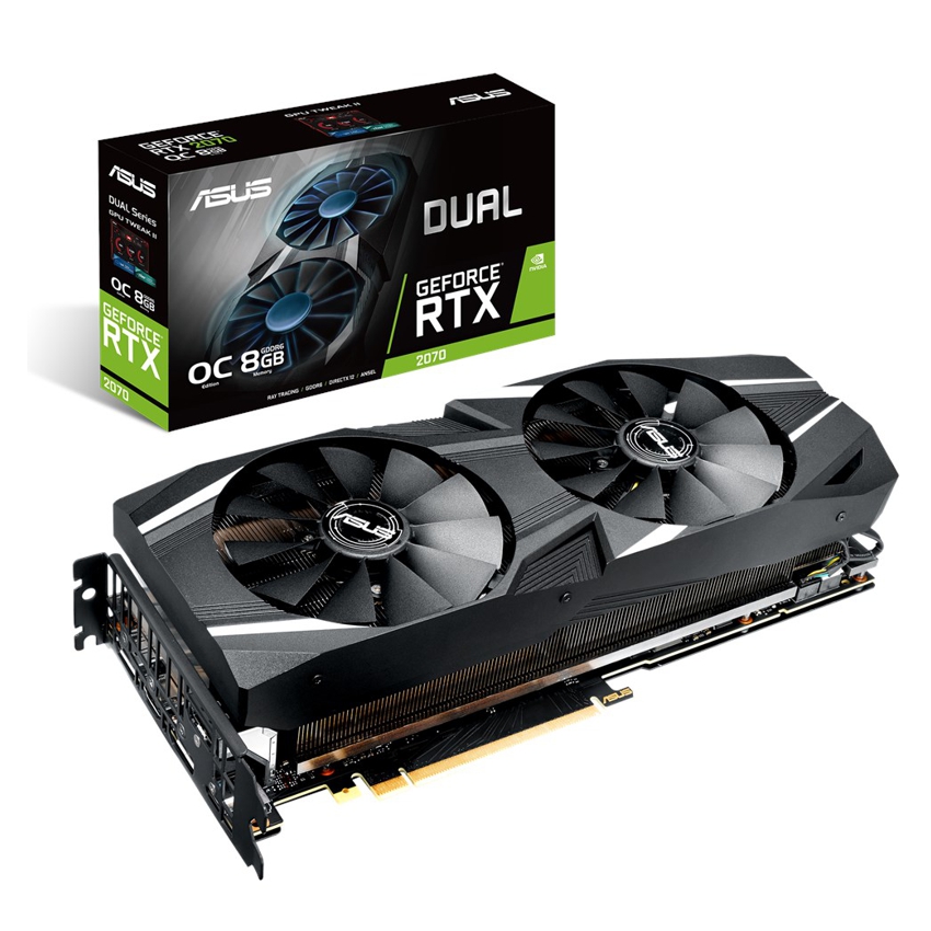 Descripción ASUS DUAL-RTX2070-O8G. Familia de procesadores de gráficos: NVIDIA. Capacidad memoria de adaptador gráfico: 8 GB, Tipo de memoria de adaptador gráfico: GDDR6, Ancho de datos: 256 bit. Máxima resolución: 7680 x 4320 Pixeles. Versión DirectX: 12.0, Versión OpenGL: 4.5. Tipo de interfaz: PCI Express 3.0. Tipo de enfriamiento: Activo, Número de ventiladores: 2 Ventilador(es), Iluminación de color: Rojo/Verde/Azul