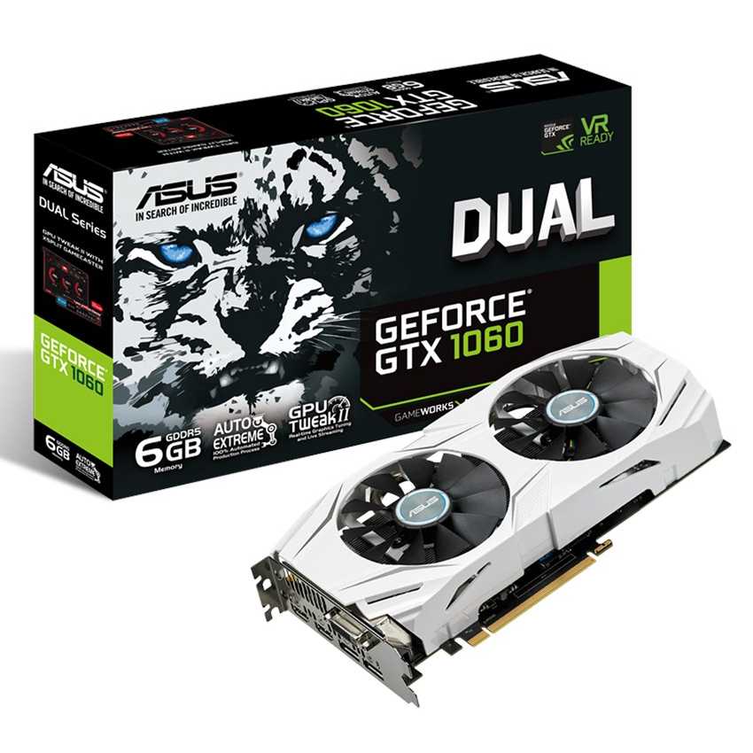 Descripción ASUS DUAL-GTX1060-O6G. Familia de procesadores de gráficos: NVIDIA, Procesador gráfico: GeForce GTX 1060, Máxima resolución: 7680 x 4320 Pixeles. Gráficos discretos memoria del adaptador: 6 GB, Tipo de memoria de adaptador gráfico: GDDR5, Ancho de datos: 192 bit. Tipo de interfaz: PCI Express 3.0, Versión HDMI: 2.0. Versión DirectX: 12.0, Versión OpenGL: 4.5. Tipo de enfriamiento: Activo, Color del producto: Color blanco