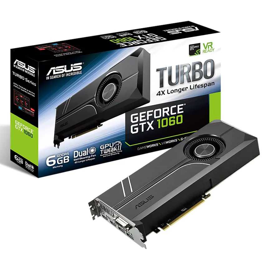 Descripción ASUS TURBO-GTX1060-6G. Familia de procesadores de gráficos: NVIDIA, Procesador gráfico: GeForce GTX 1060, Máxima resolución: 7680 x 4320 Pixeles. Gráficos discretos memoria del adaptador: 6 GB, Tipo de memoria de adaptador gráfico: GDDR5, Ancho de datos: 192 bit. Tipo de interfaz: PCI Express 3.0, Versión HDMI: 2.0. Versión DirectX: 12.0, Versión OpenGL: 4.5. Tipo de enfriamiento: Activo, Color del producto: Negro