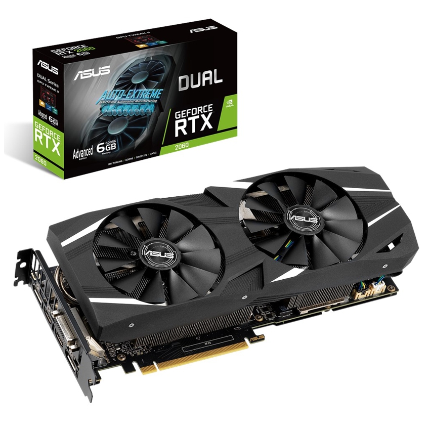 Descripción ASUS Dual DUAL-RTX2060-A6G. Familia de procesadores de gráficos: NVIDIA, Procesador gráfico: GeForce RTX 2060, Frecuencia del procesador: 1365 MHz. Capacidad memoria de adaptador gráfico: 6 GB, Tipo de memoria de adaptador gráfico: GDDR6, Ancho de datos: 192 bit, Velocidad de memoria del reloj: 14000 MHz. Máxima resolución: 7680 x 4320 Pixeles. Versión DirectX: 12.0, Versión OpenGL: 4.5, Dual Link DVI. Tipo de interfaz: PCI Express 3.0. Tipo de enfriamiento: Activo, Número de ventiladores: 2 Ventilador(es)