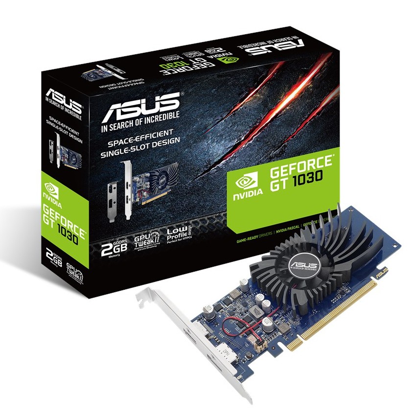 Descripción ASUS GT1030-2G-BRK. Familia de procesadores de gráficos: NVIDIA, Procesador gráfico: GeForce GT 1030, Frecuencia del procesador: 1266 MHz. Capacidad memoria de adaptador gráfico: 2 GB, Tipo de memoria de adaptador gráfico: GDDR5, Ancho de datos: 64 bit, Velocidad de memoria del reloj: 6008 MHz. Máxima resolución: 7680 x 4320 Pixeles. Versión DirectX: 12.0, Versión OpenGL: 4.5. Tipo de interfaz: PCI Express 3.0. Tipo de enfriamiento: Activo, Número de ventiladores: 1 Ventilador(es)