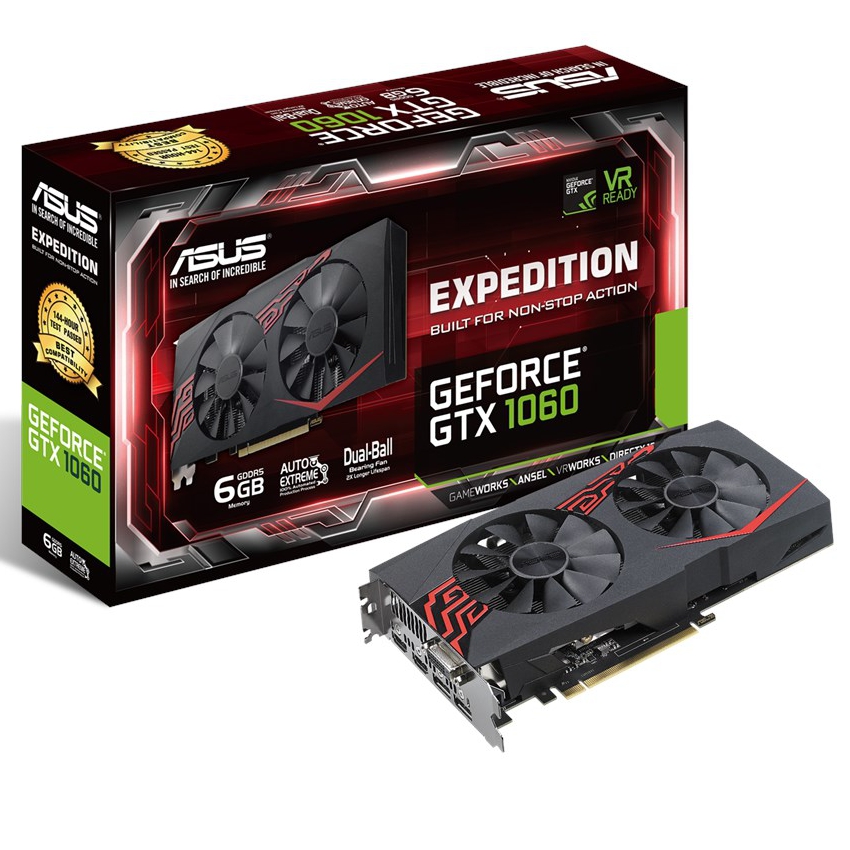 Descripción ASUS EX-GTX1060-6G. Familia de procesadores de gráficos: NVIDIA, Procesador gráfico: GeForce GTX 1060, Frecuencia del procesador: 1506 MHz. Capacidad memoria de adaptador gráfico: 6 GB, Tipo de memoria de adaptador gráfico: GDDR5, Ancho de datos: 192 bit, Velocidad de memoria del reloj: 8008 MHz. Máxima resolución: 7680 x 4320 Pixeles. Versión OpenGL: 4.5. Tipo de interfaz: PCI Express 3.0. Tipo de enfriamiento: Activo, Número de ventiladores: 2 Ventilador(es)