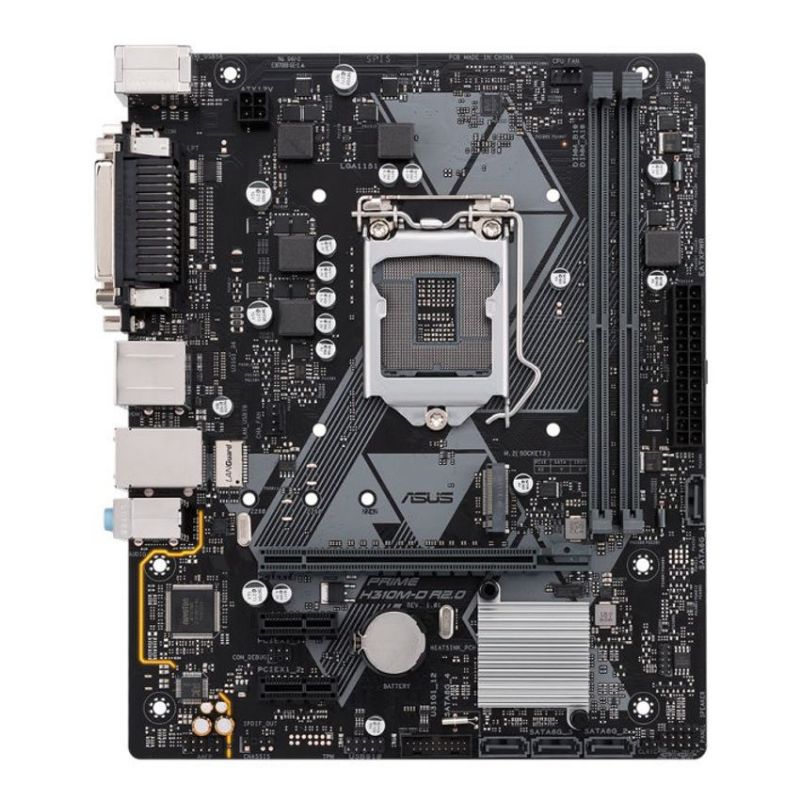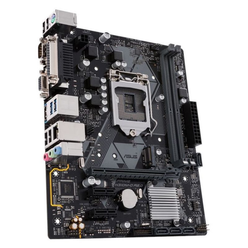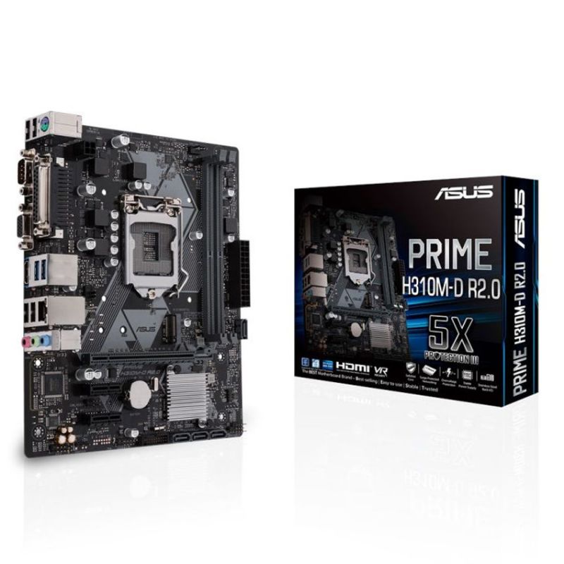 Descripción ASUS PRIME H310M-D R2.0. Fabricante de procesador: Intel, Socket de procesador: LGA 1151 (Zócalo H4), Procesador compatible: Intel® Celeron®, Intel® Core™ i3, Intel Core i5, Intel Core i7, Intel® Pentium®. tipos de memoria compatibles: DDR4-SDRAM, Tipo de ranuras de memoria: DIMM, Velocidades de reloj de memoria soportadas: 2133,2400,2666 MHz. Memoria máxima de adaptador de gráficos: 1024 MB, Máxima resolución: 4096 x 2160 Pixeles. Versión HDMI: 1.4b. Tipo de interfaz ethernet: Gigabit Ethernet, Controlador LAN: Realtek RTL8111H