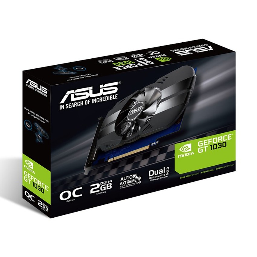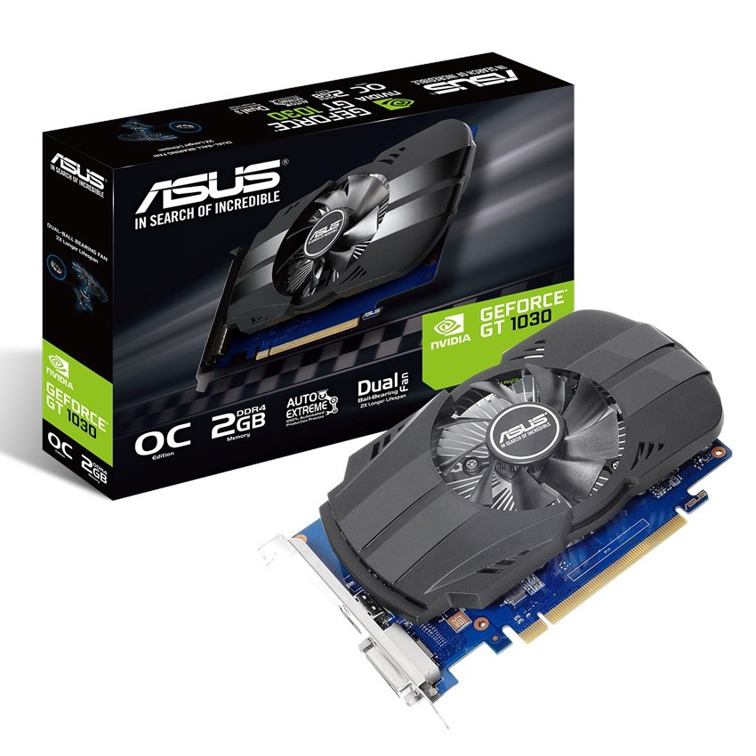 Descripción ASUS PH-GT1030-O2GD4. Familia de procesadores de gráficos: NVIDIA, Procesador gráfico: GeForce GT 1030. Gráficos discretos memoria del adaptador: 2 GB, Tipo de memoria de adaptador gráfico: GDDR4, Ancho de datos: 64 bit, Velocidad de memoria del reloj: 2100 MHz. Máxima resolución: 1920 x 1200 Pixeles. Versión DirectX: 12.0, Versión OpenGL: 4.5. Tipo de interfaz: PCI Express 3.0. Tipo de enfriamiento: Activo, Número de ventiladores: 1 Ventilador(es)