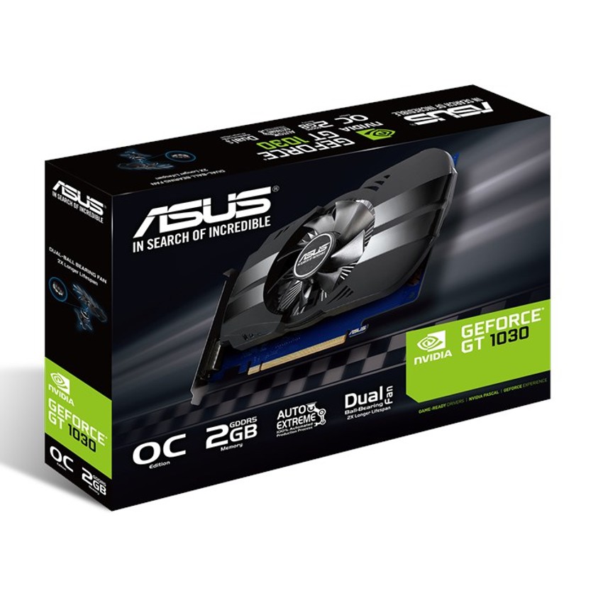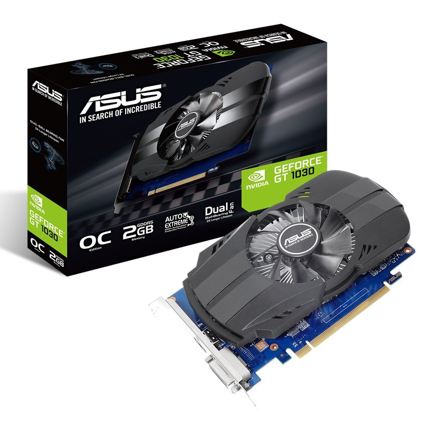 Descripción ASUS PH-GT1030-O2G. Familia de procesadores de gráficos: NVIDIA, Procesador gráfico: GeForce GT 1030, Máxima resolución: 1920 x 1200 Pixeles. Gráficos discretos memoria del adaptador: 2 GB, Tipo de memoria de adaptador gráfico: GDDR5, Ancho de datos: 64 bit. Tipo de interfaz: PCI Express 3.0. Tipo de enfriamiento: Activo, Número de ventiladores: 1 fan(s), Color del producto: Negro, Azul, Acero inoxidable. Profundidad: 111 mm, Altura: 36 mm, Ancho: 184 mm