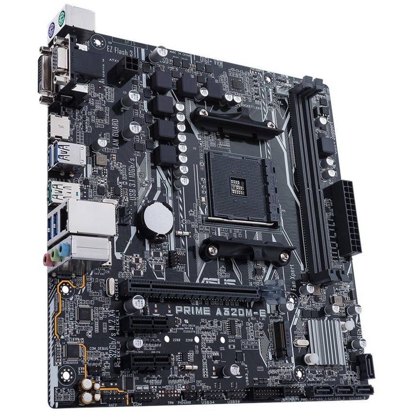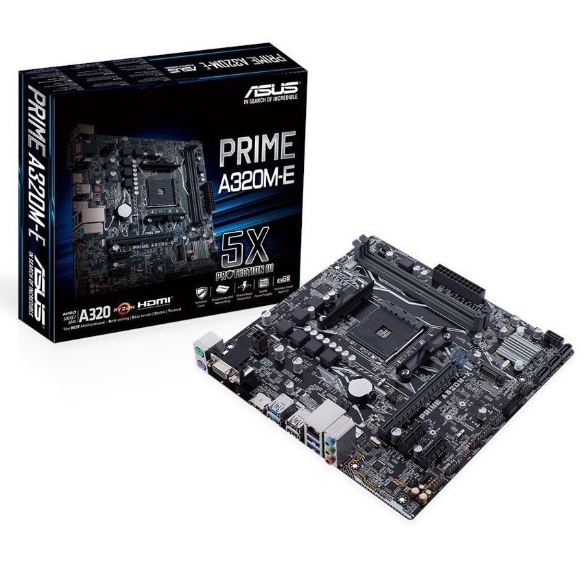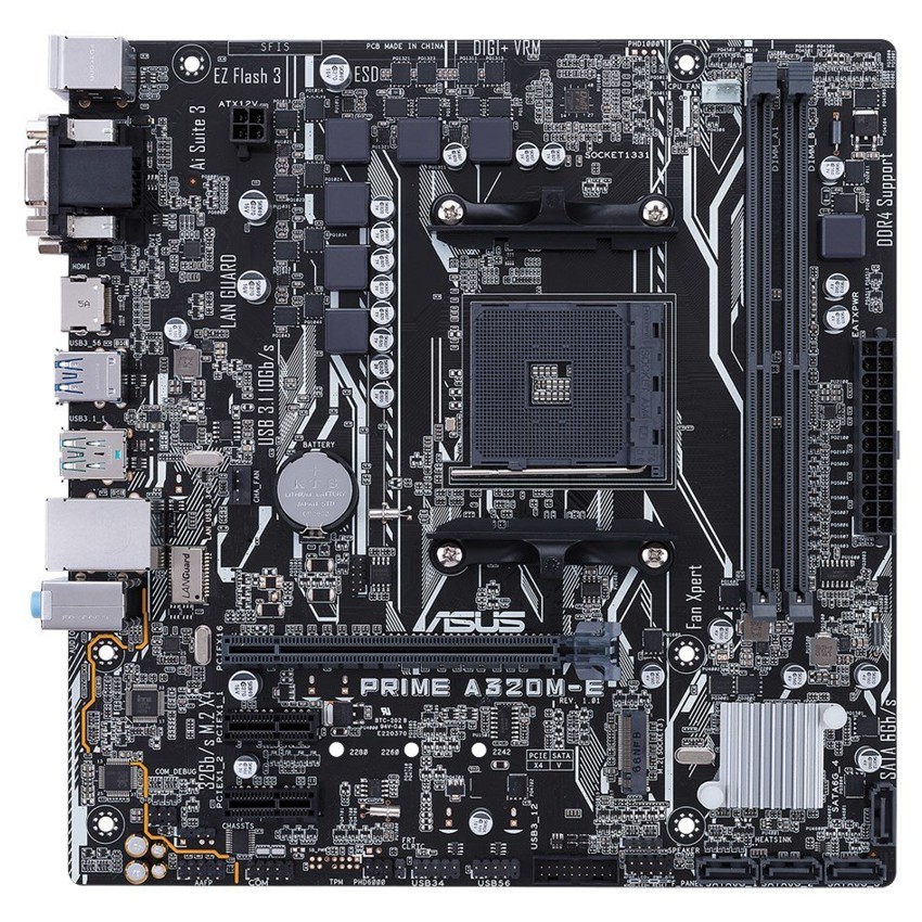 Descripción ASUS PRIME A320M-E. tipos de memoria compatibles: DDR4-SDRAM, Tipo de ranuras de memoria: DIMM, Velocidades de reloj de memoria soportadas: 2133,2400,2666,2933,3200 MHz. Familia de procesador: AMD, Procesador compatible: AMD A,Athlon,Ryzen, Socket de procesador: Socket AM4. Versión HDMI: 1.4b. Controlador LAN: Realtek RTL8111H, Tipo de interfaz ethernet: Gigabit Ethernet. Componente para: PC, Familia de componentes de tarjeta madre: AMD, Circuito integrado de tarjeta madre: AMD A320