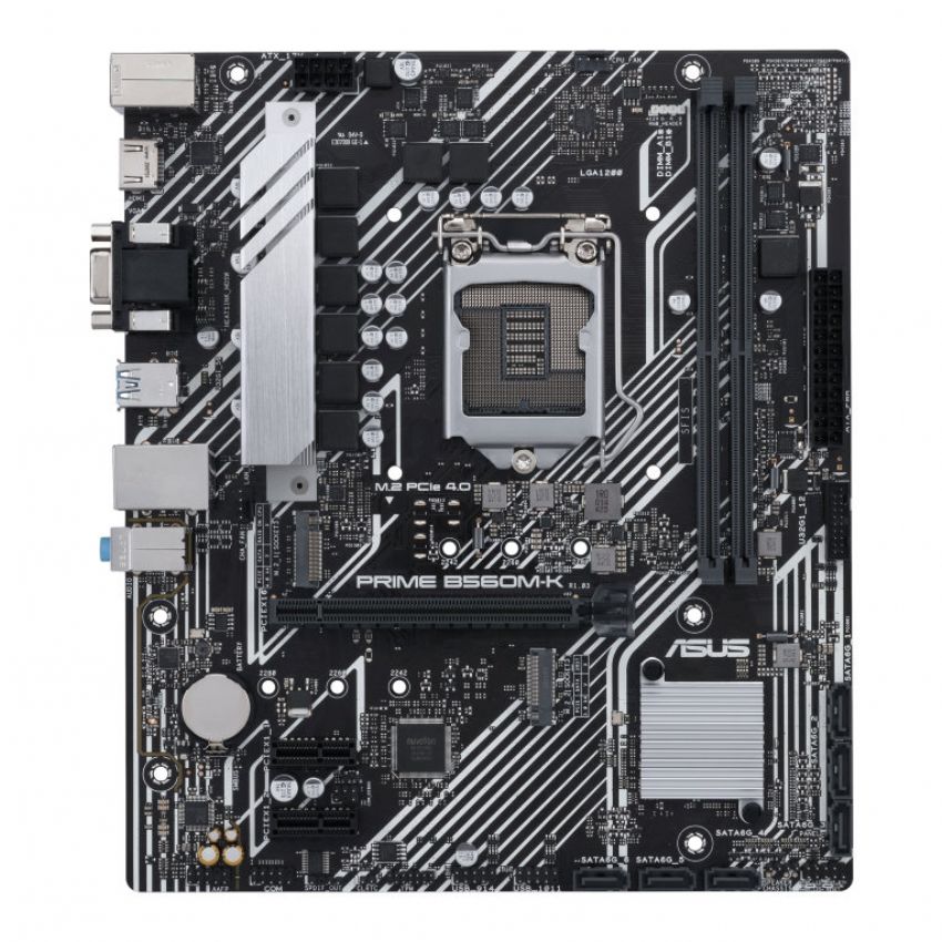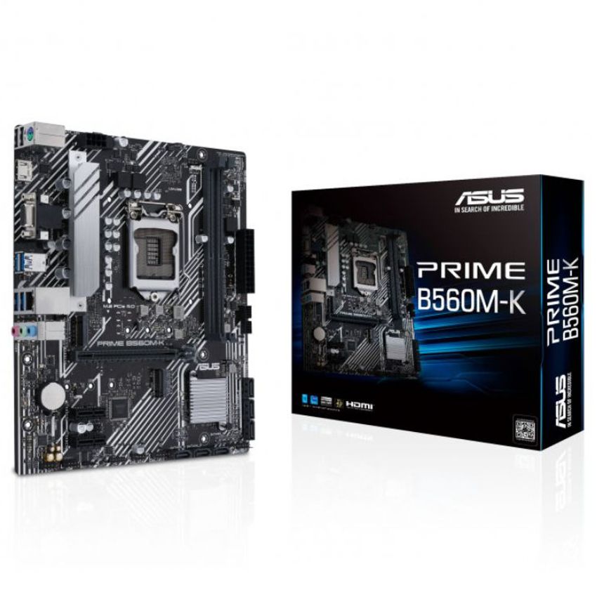 Descripción ASUS PRIME B560M-K. Fabricante de procesador: Intel, Socket de procesador: LGA 1200, Procesador compatible: Intel® Celeron®, Intel® Core™ i3, Intel Core i5, Intel Core i7, Intel Core i9, Intel® Pentium® G. tipos de memoria compatibles: DDR4-SDRAM, Tipo de ranuras de memoria: DIMM, Velocidades de reloj de memoria soportadas: 2133,2400,2666,2800,2933,3200,3333,3466,3600,3733,4000,4266,4400,4600,4800,5000 MHz. Interfaces de disco de almacenamiento soportados: M.2, Serial ATA III, Tipos de unidades de almacenamiento admitidas: HDD & SSD. Máxima resolución: 3840 x 2160 Pixeles. Conector USB: USB tipo A