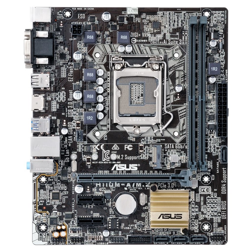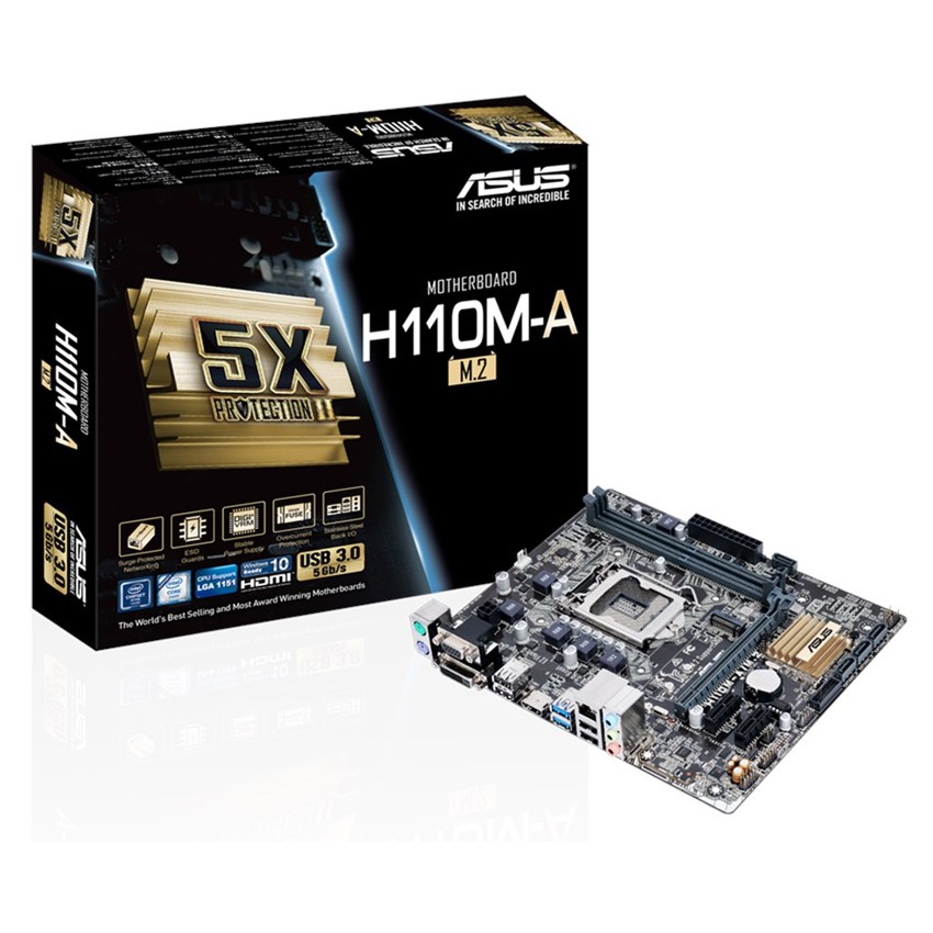 Descripción ASUS H110M-A/M.2/CSM. tipos de memoria compatibles: DDR4-SDRAM, Tipo de ranuras de memoria: DIMM, Velocidades de reloj de memoria soportadas: 2133,2400 MHz. Familia de procesador: Intel, Procesador compatible: Celeron,Core i3,Core i5,Core i7,Pentium, Socket de procesador: LGA 1151 (Socket H4). Controlador LAN: Intel I219-V, Tipo de interfaz ethernet: Gigabit Ethernet. Componente para: PC, Familia de componentes de tarjeta madre: Intel, Circuito integrado de tarjeta madre: Intel H110. Memoria máxima de adaptador de gráficos: 1024 MB, Máxima resolución: 4096 x 2160 Pixeles
