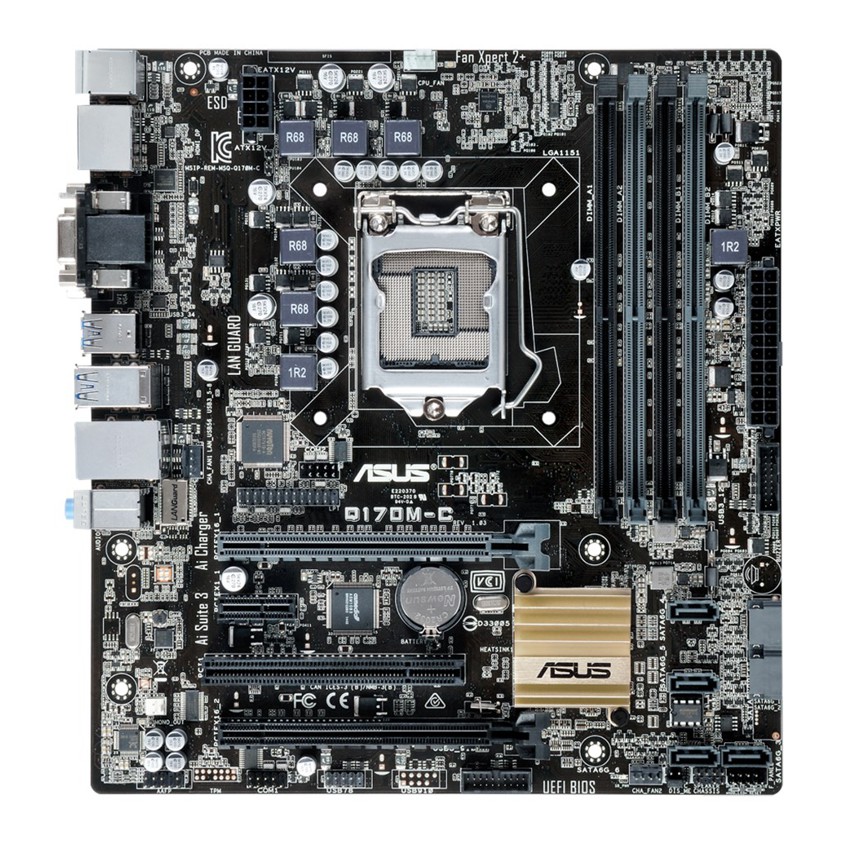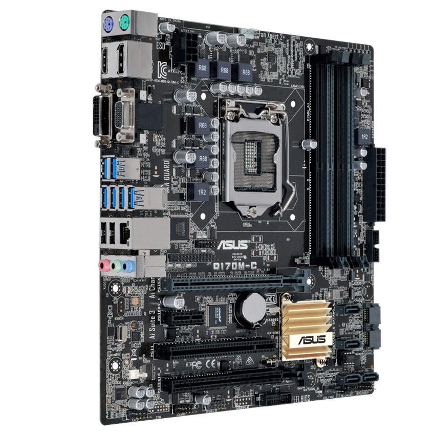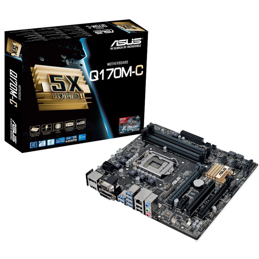 Descripción ASUS Q170M-C. tipos de memoria compatibles: DDR4-SDRAM, Tipo de ranuras de memoria: DIMM, Velocidades de reloj de memoria soportadas: 2133 MHz. Familia de procesador: Intel, Procesador compatible: Celeron,Celeron D,Celeron Dual-Core,Celeron G,Celeron M,Core i3,Core i7,Core i7 Extreme Edition,Pent. Interfaces de disco de almacenamiento soportados: Serial ATA III. Conector USB: USB Type-A. Controlador LAN: Intel I219-LM