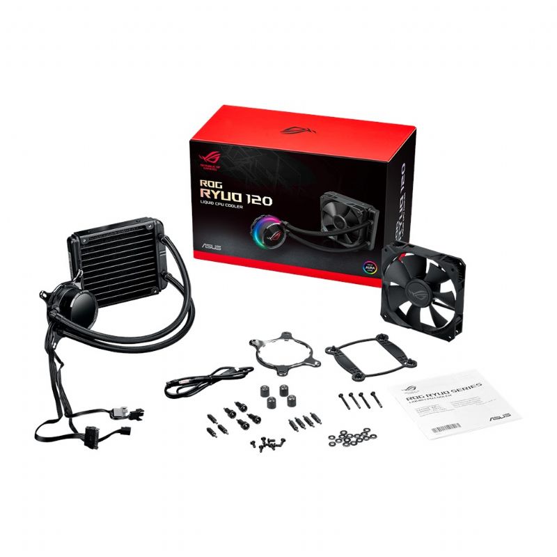 Descripción ASUS ROG RYUO 120. Utilizar con: Procesador, Nivel de ruido: 37 dB, Número de ventiladores: 1 Ventilador(es). Tipo: Interno, Material: Aluminio, Cobre, De plástico, Caucho, Material de bloque de agua: Cobre. Diámetro de ventilador: 12 cm, Grosor de ventilador: 2,5 cm, Dimensiones del ventilador (A x A x P): 120 x 120 x 25 mm