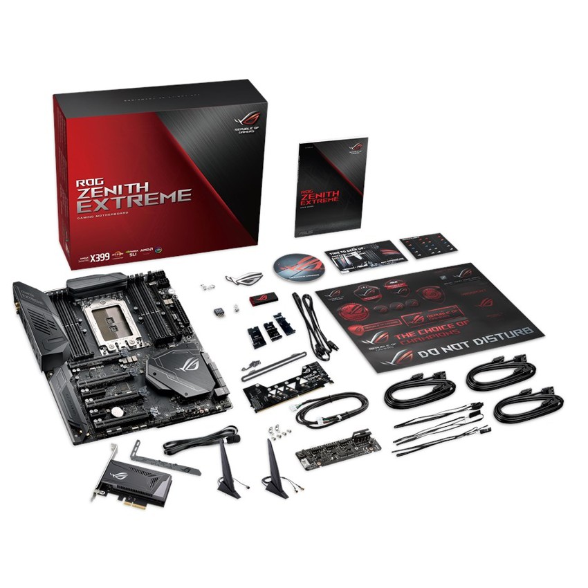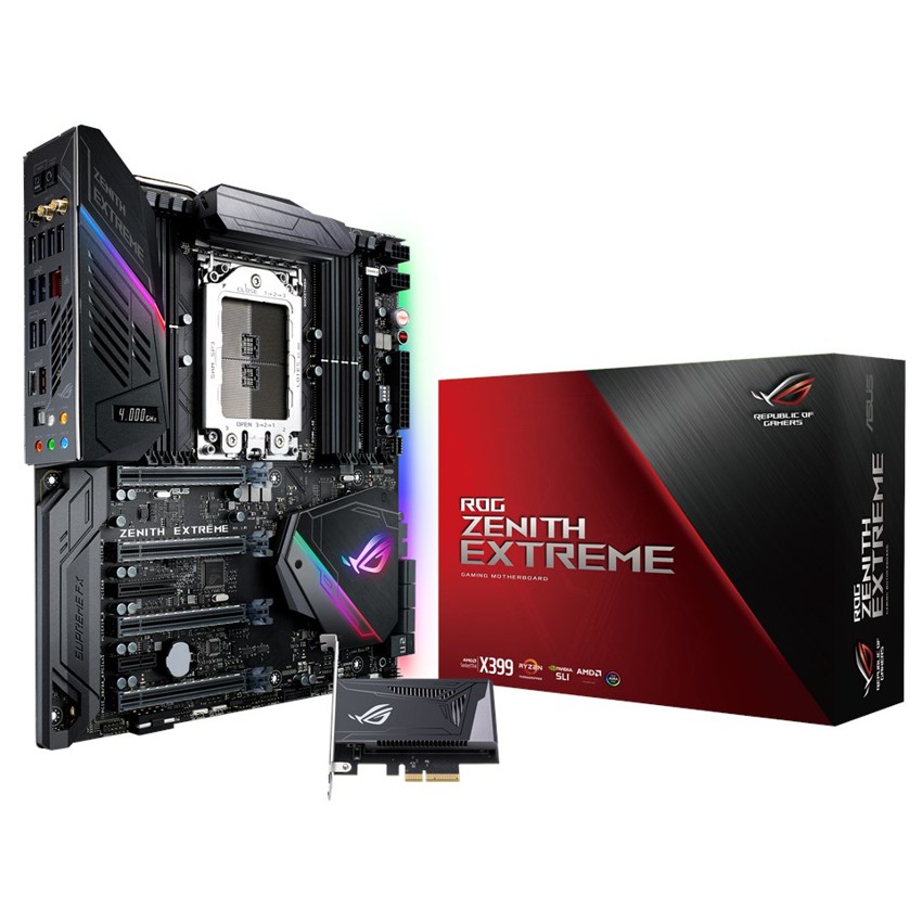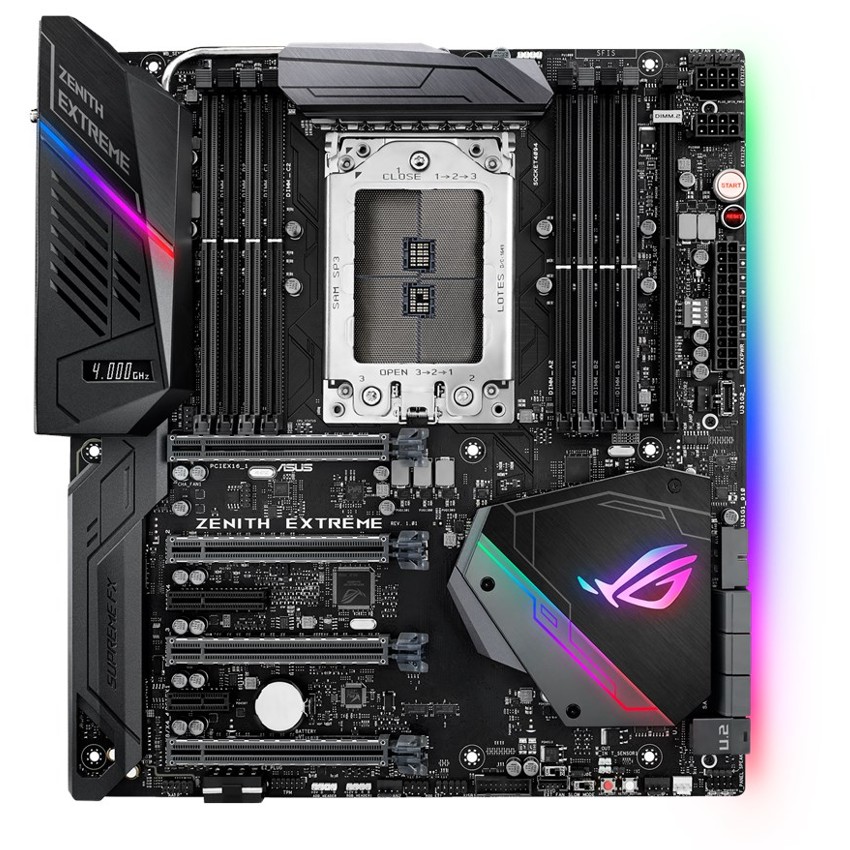 Descripción ASUS ROG ZENITH EXTREME. tipos de memoria compatibles: DDR4-SDRAM, Tipo de ranuras de memoria: DIMM, Velocidades de reloj de memoria soportadas: 2133,2400,2666,2800,3200,3600 MHz. Familia de procesador: AMD, Procesador compatible: Ryzen, Socket de procesador: Socket TR4. Controlador LAN: Intel I211-AT, Tipo de interfaz ethernet: Gigabit Ethernet, Wi-Fi estándares: IEEE 802.11a,IEEE 802.11ac,IEEE 802.11ad,IEEE 802.11b,IEEE 802.11g,IEEE 802.11n. Componente para: PC, Familia de componentes de tarjeta madre: AMD, Circuito integrado de tarjeta madre: AMD X399. Soporte para proceso paralelo: 4-Way CrossFireX,4-Way SLI