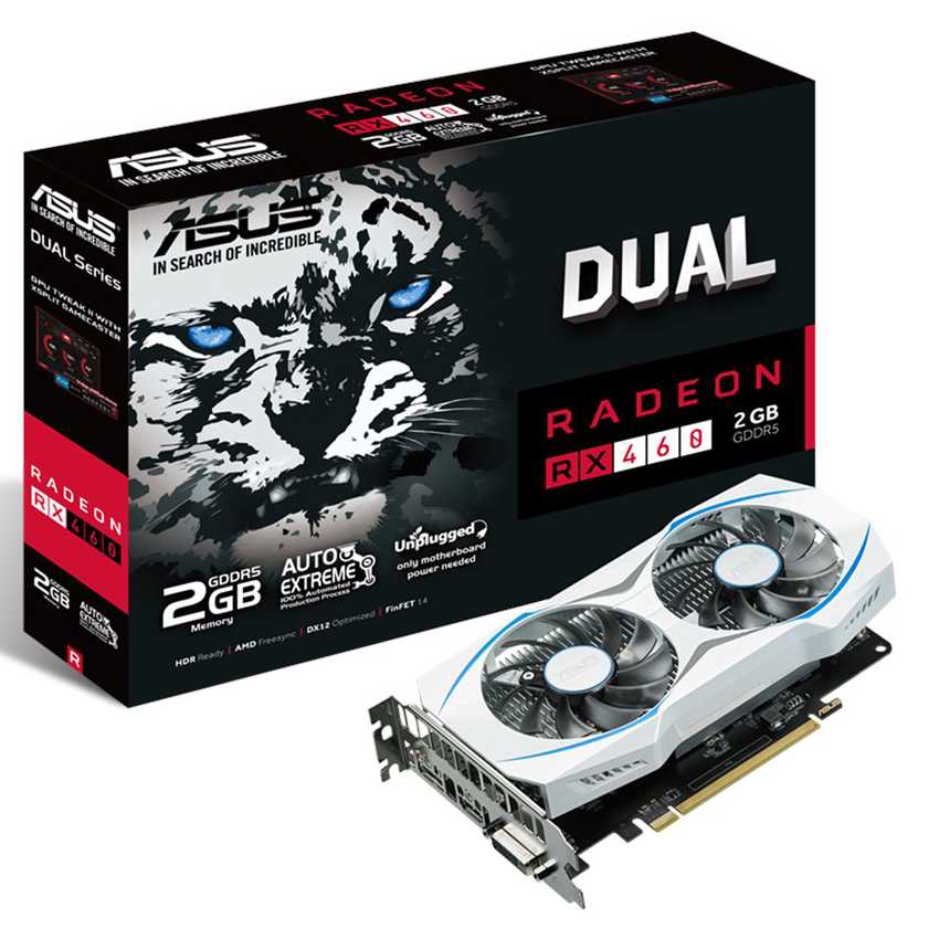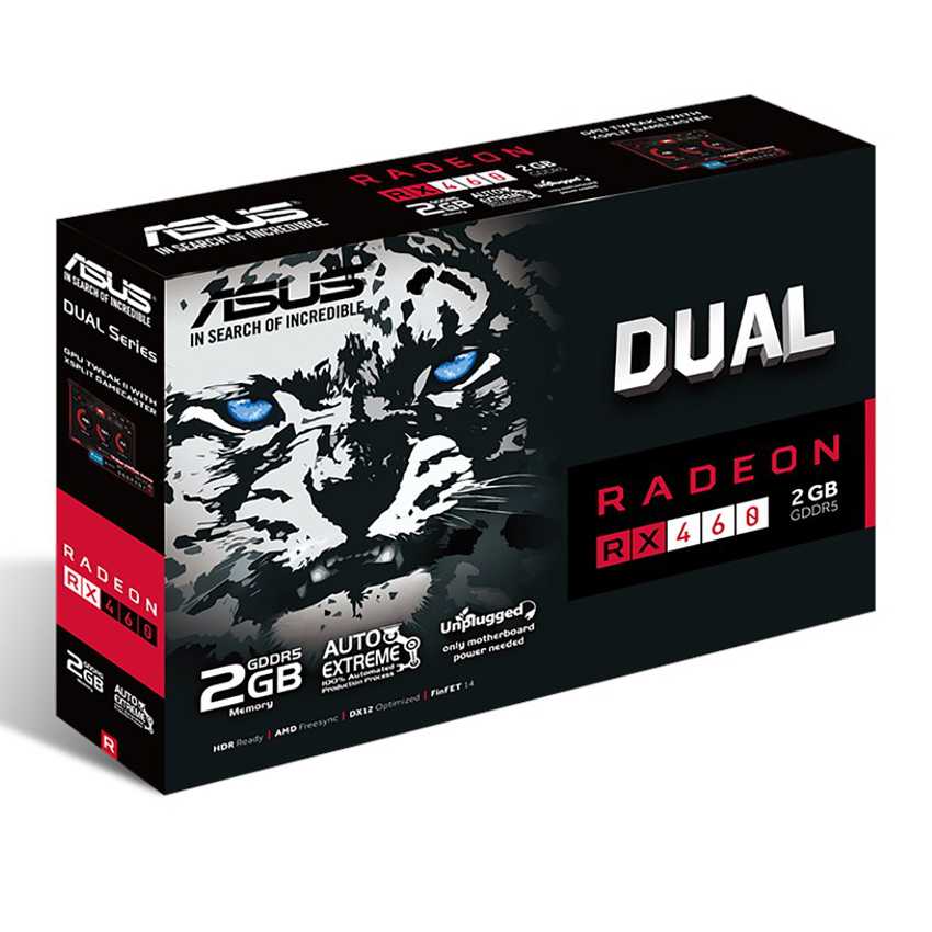 Descripción ASUS DUAL-RX460-2G. Familia de procesadores de gráficos: AMD, Procesador gráfico: Radeon RX 460, Máxima resolución: 5120 x 2880 Pixeles. Gráficos discretos memoria del adaptador: 2 GB, Tipo de memoria de adaptador gráfico: GDDR5, Ancho de datos: 128 bit. Tipo de interfaz: PCI Express 3.0. Versión DirectX: 12.0, Versión OpenGL: 4.4. Tipo de enfriamiento: Activo