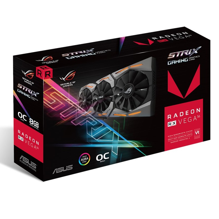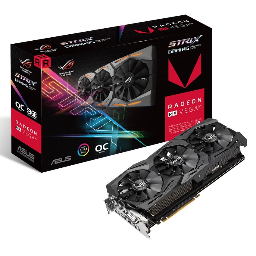 Descripción ASUS ROG-STRIX-RXVEGA56-O8G-GAMING. Familia de procesadores de gráficos: AMD, Procesador gráfico: Radeon RX Vega 56, Frecuencia del procesador: 1297 MHz. Gráficos discretos memoria del adaptador: 8 GB, Ancho de datos: 2048 bit, Velocidad de memoria del reloj: 800 MHz. Máxima resolución: 7680 x 4320 Pixeles. Tipo de interfaz: PCI Express 3.0. Tipo de enfriamiento: Activo, Número de ventiladores: 3 Ventilador(es)