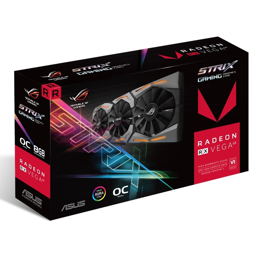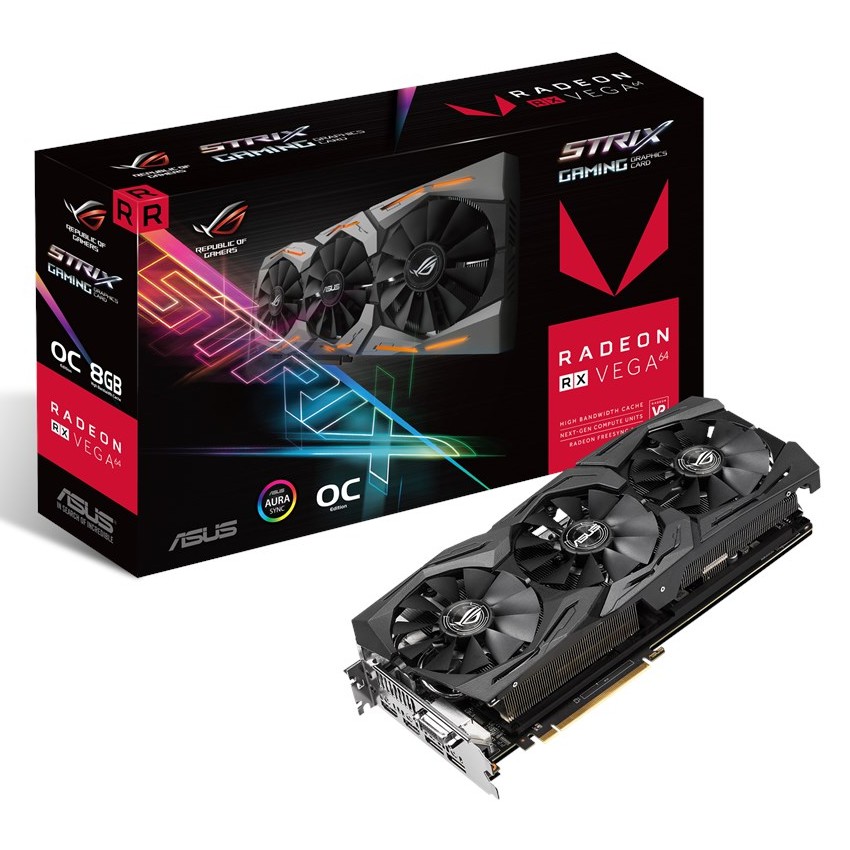Descripción ASUS ROG STRIX Radeon RX Vega64. Familia de procesadores de gráficos: AMD, Procesador gráfico: Radeon RX Vega 64, Frecuencia del procesador: 1298 MHz. Gráficos discretos memoria del adaptador: 8 GB, Ancho de datos: 2048 bit, Velocidad de memoria del reloj: 945 MHz. Máxima resolución: 7680 x 4320 Pixeles. Versión OpenGL: 4.5. Tipo de interfaz: PCI Express 3.0. Tipo de enfriamiento: Activo, Número de ventiladores: 3 Ventilador(es), Iluminación de color: Multi