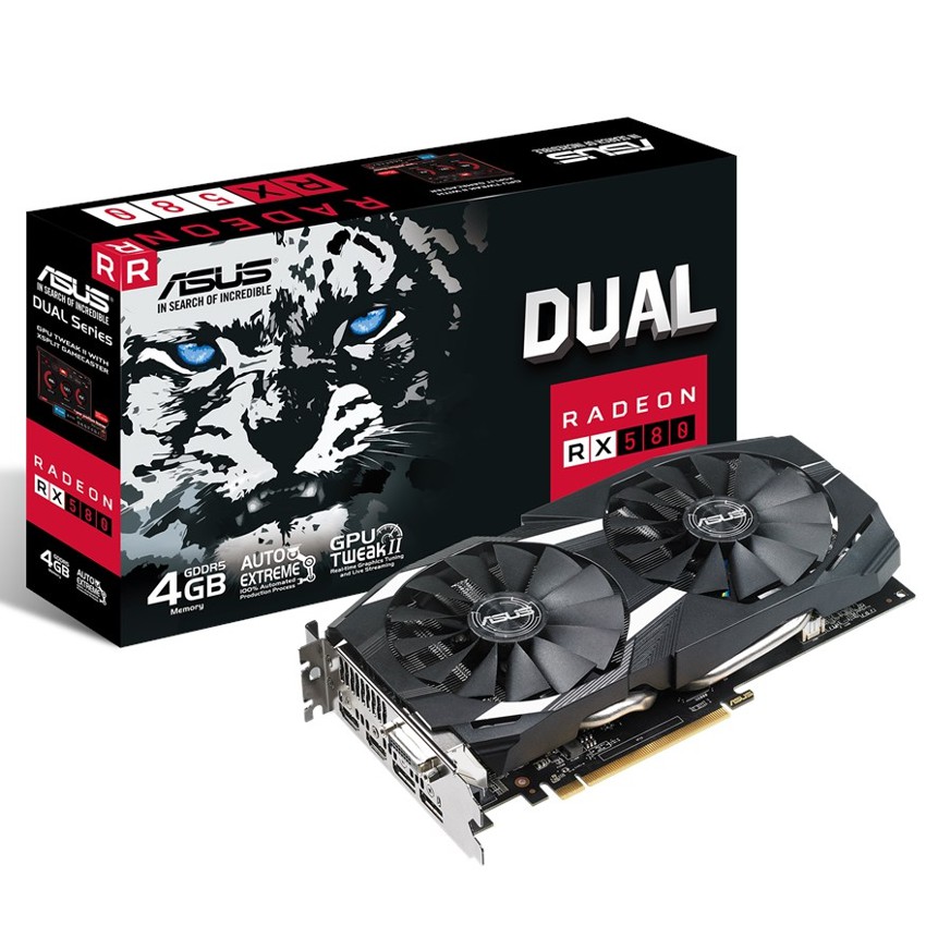 Descripción ASUS Dual Radeon RX 580. Familia de procesadores de gráficos: AMD, Procesador gráfico: Radeon RX 580, Frecuencia del procesador: 1340 MHz. Gráficos discretos memoria del adaptador: 4 GB, Tipo de memoria de adaptador gráfico: GDDR5, Ancho de datos: 256 bit, Velocidad de memoria del reloj: 7000 MHz. Máxima resolución: 7680 x 4320 Pixeles. Versión DirectX: 12.0, Versión OpenGL: 4.5. Tipo de interfaz: PCI Express 3.0. Tipo de enfriamiento: Activo, Número de ventiladores: 2 Ventilador(es)