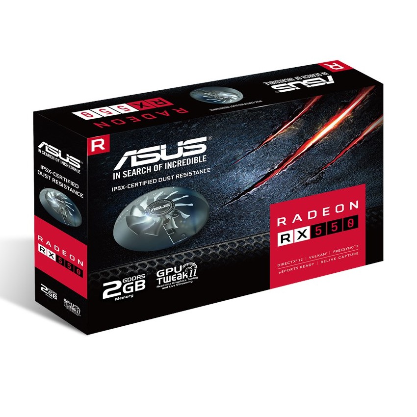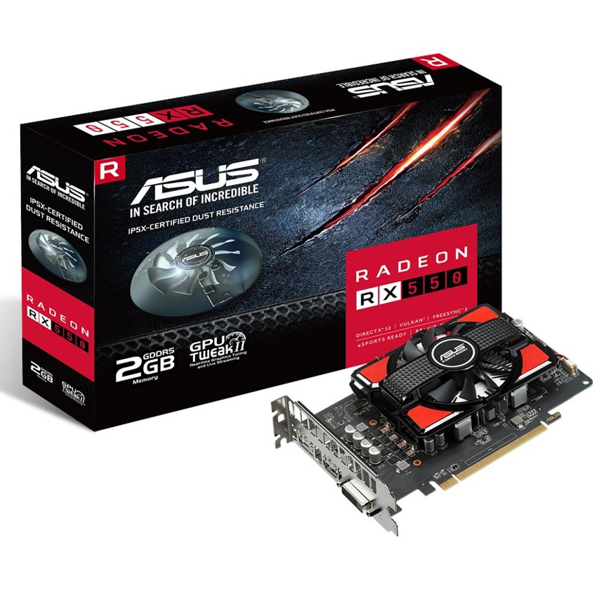 Descripción ASUS RX550-2G. Familia de procesadores de gráficos: AMD, Procesador gráfico: Radeon RX 550, Máxima resolución: 5120 x 2880 Pixeles. Gráficos discretos memoria del adaptador: 2 GB, Tipo de memoria de adaptador gráfico: GDDR5, Ancho de datos: 128 bit. Tipo de interfaz: PCI Express 3.0. Tipo de enfriamiento: Activo, Número de ventiladores: 1 fan(s), Color del producto: Negro, Rojo. Profundidad: 43 mm, Altura: 112 mm, Ancho: 182 mm