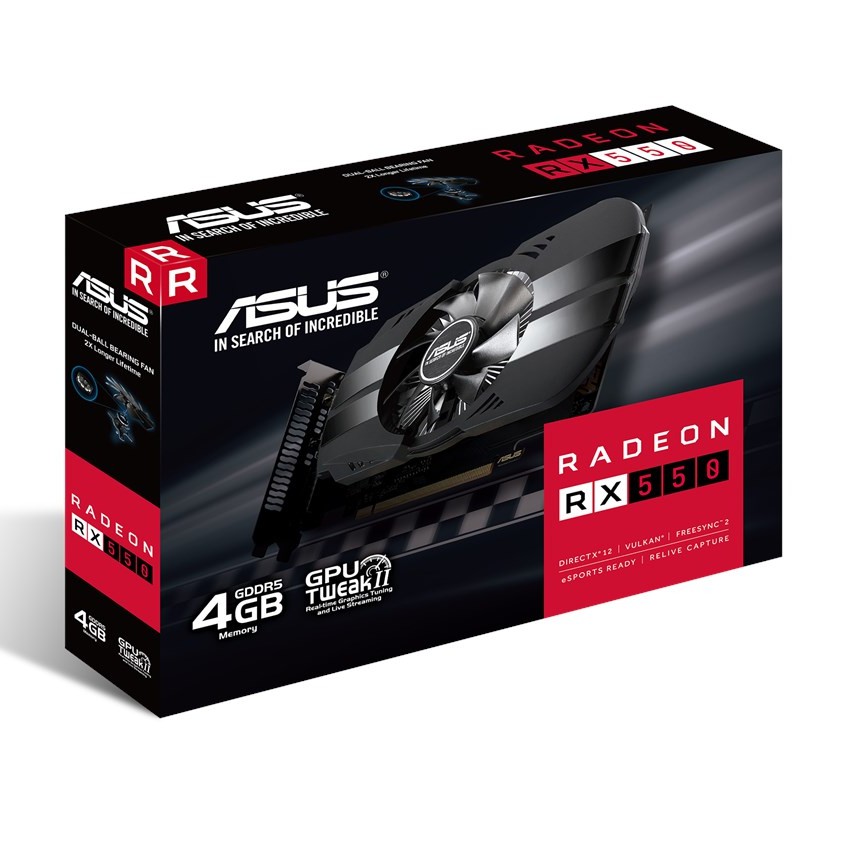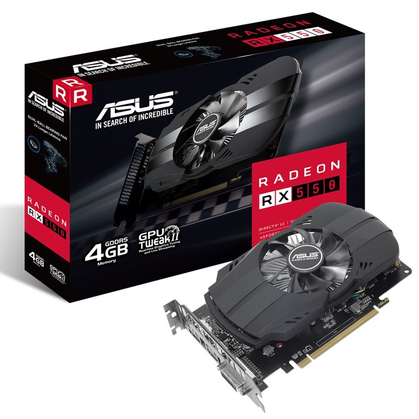 Descripción ASUS PH-RX550-4G-M7. Familia de procesadores de gráficos: AMD, Procesador gráfico: Radeon RX 550, Frecuencia del procesador: 1071 MHz. Gráficos discretos memoria del adaptador: 4 GB, Tipo de memoria de adaptador gráfico: GDDR5, Ancho de datos: 128 bit, Velocidad de memoria del reloj: 7000 MHz. Máxima resolución: 5120 x 2880 Pixeles. Versión DirectX: 12.0, Versión OpenGL: 4.5. Tipo de interfaz: PCI Express x16 3.0. Tipo de enfriamiento: Activo, Número de ventiladores: 1 Ventilador(es)