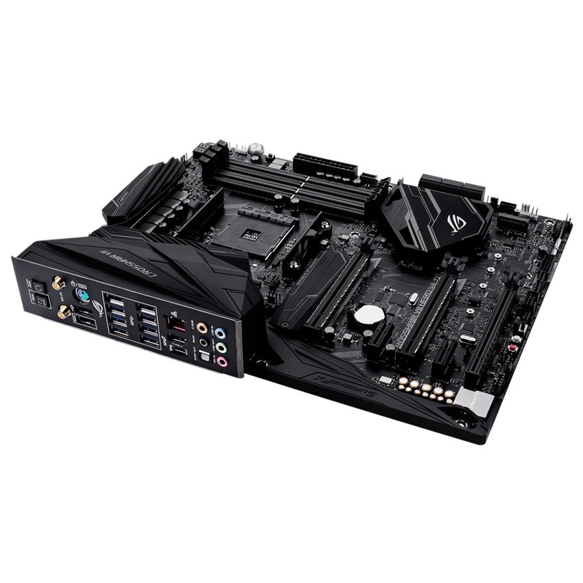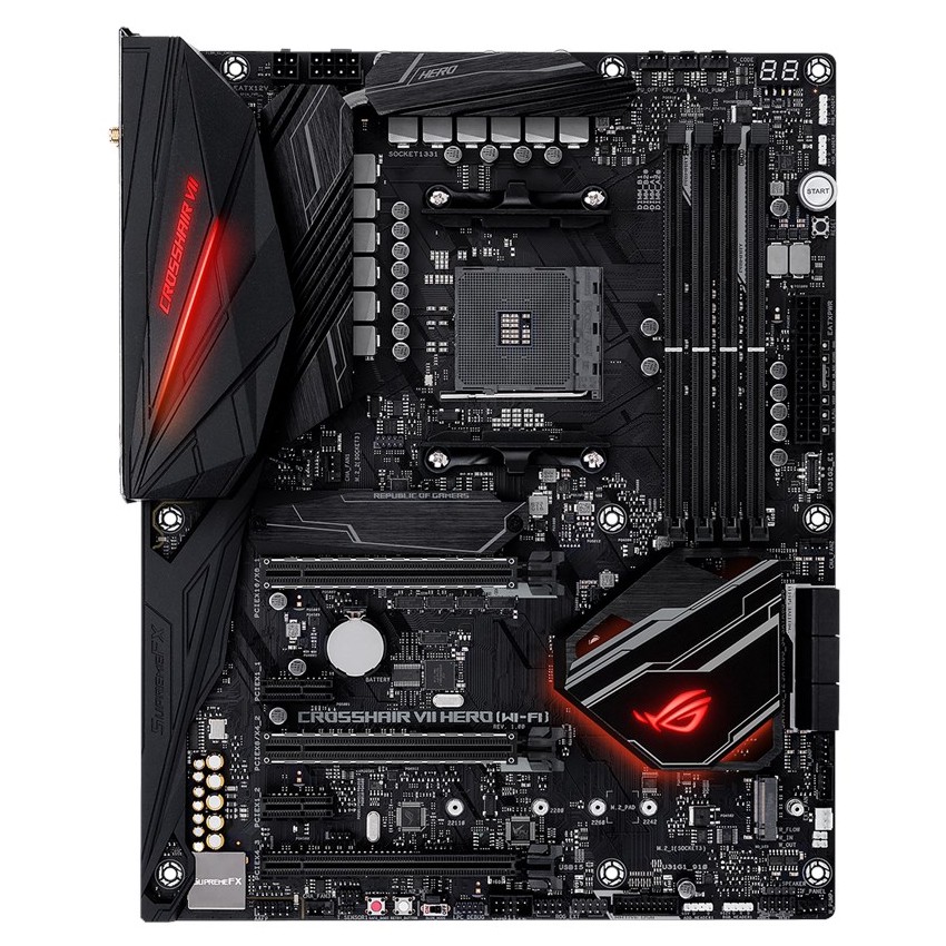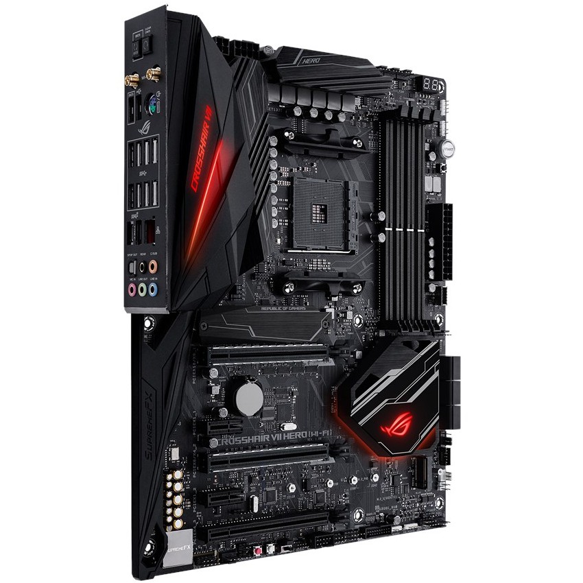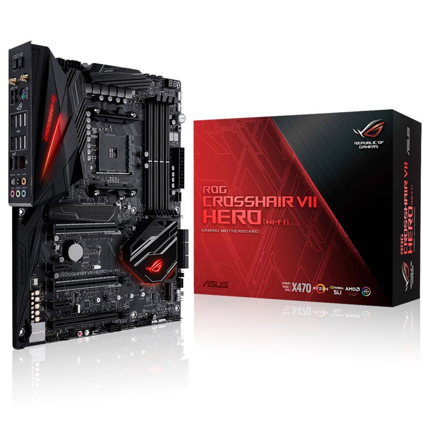 Descripción ASUS ROG CROSSHAIR VII HERO (WI-FI). tipos de memoria compatibles: DDR4-SDRAM, Tipo de ranuras de memoria: DIMM, Velocidades de reloj de memoria soportadas: 2133,2400,2666,2800,2933,3000,3200,3466 MHz. Fabricante de procesador: AMD, Procesador compatible: AMD A,AMD Athlon X4,AMD Ryzen, Socket de procesador: Socket AM4. Controlador LAN: Intel I211-AT, Tipo de interfaz ethernet: Gigabit Ethernet, Wi-Fi estándares: IEEE 802.11a,IEEE 802.11ac,IEEE 802.11b,IEEE 802.11g,IEEE 802.11n. Componente para: PC, Familia de componentes de tarjeta madre: AMD, Circuito integrado de tarjeta madre: AMD X470. Tipos de BIOS: UEFI AMI, BIOS, tamaño de memoria: 32 MB