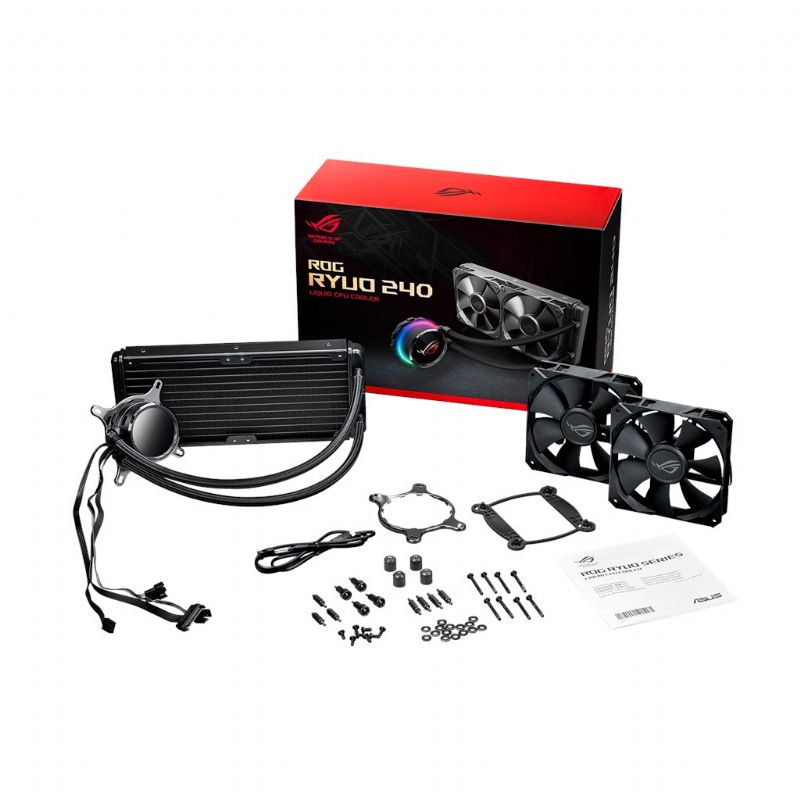 Descripción ASUS ROG RYUO 240. Utilizar con: Procesador, Nivel de ruido: 37 dB, Número de ventiladores: 2 Ventilador(es). Tipo: Interno, Material: Aluminio, De plástico, Caucho, Material de bloque de agua: Cobre. Diámetro de ventilador: 12 cm, Grosor de ventilador: 2,5 cm, Dimensiones del ventilador (A x A x P): 120 x 120 x 25 mm. Tipo de embalaje: Caja