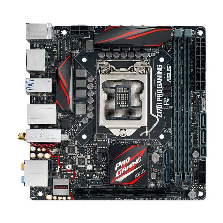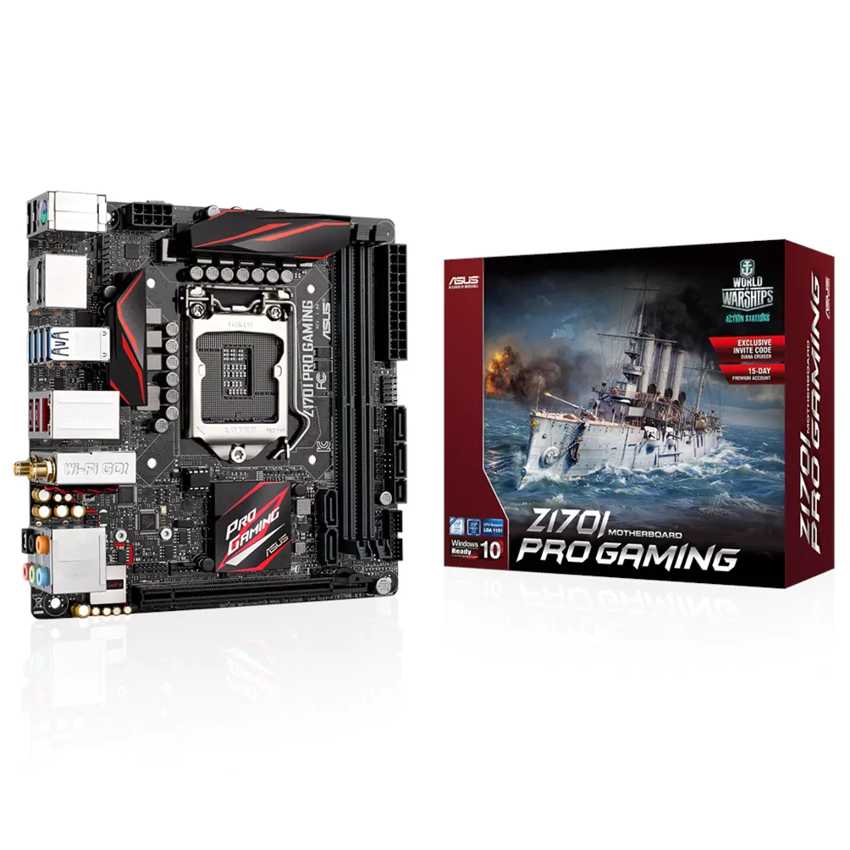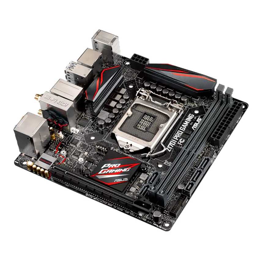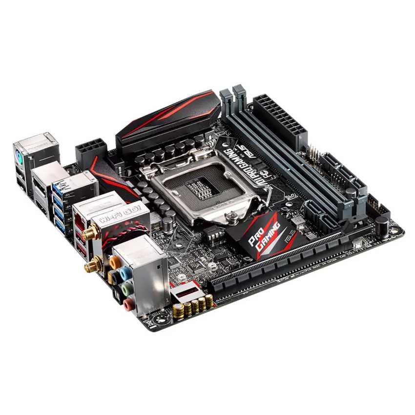 Descripción ASUS Z170I Pro Gaming. tipos de memoria compatibles: DDR4-SDRAM, Tipo de ranuras de memoria: DIMM, Canales de memoria: Dual. Familia de procesador: Intel, Procesador compatible: Core i5, Core i7, Celeron, Pentium, Core i3, Socket de procesador: LGA1151. Interfaces de unidad de disco duro soportadas: Serial ATA III, M.2. Controlador LAN: Intel I219-V, Tipo de interfaz ethernet: Gigabit, Wi-Fi estándares: 802.11g, 802.11ac, 802.11b, 802.11n. Componente para: PC, Familia de componentes de tarjeta madre: Intel, Tarjeta madre, factor de forma: Mini ITX