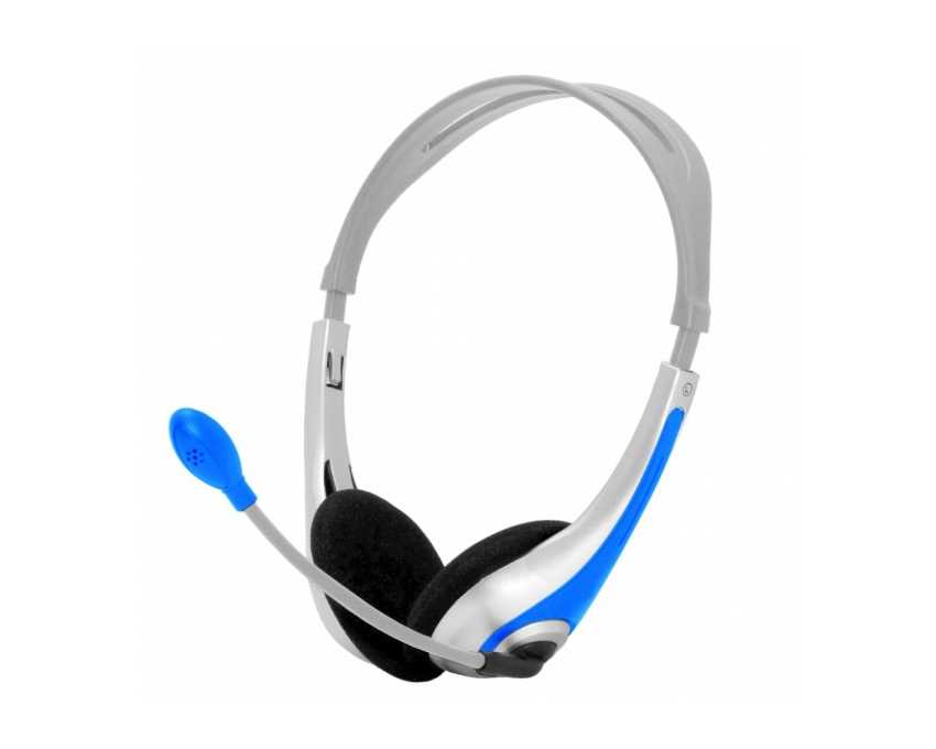 Especificaciones técnicas -Con 2 conectores jack stereo de 3,5 mm para la conexión a su PC/ portátil -Cable de 2 metros y paso de cable unilateral -Regulador de volumen e interruptor de encendido/ apagado de micrófono integrados en el cable -Micrófono con cancelación de ruido incorporado en un brazo flexible -Auriculares. Impedancia: 32; Sensibilidad: 108dB, +/- 3dB; Respuesta de Frecuencia: 15Hz a 20KHz -Micrófono. Impedancia: 10 KΩ; Sensibilidad: -58 dB +/- 3dB; Respuesta de Frecuencia: 30Hz a 15KHz Características -Color: Azul y Plata -Peso: 85 g -Material: plástico -Garantía: 2 años Embalaje -Auriculares PC Stereo