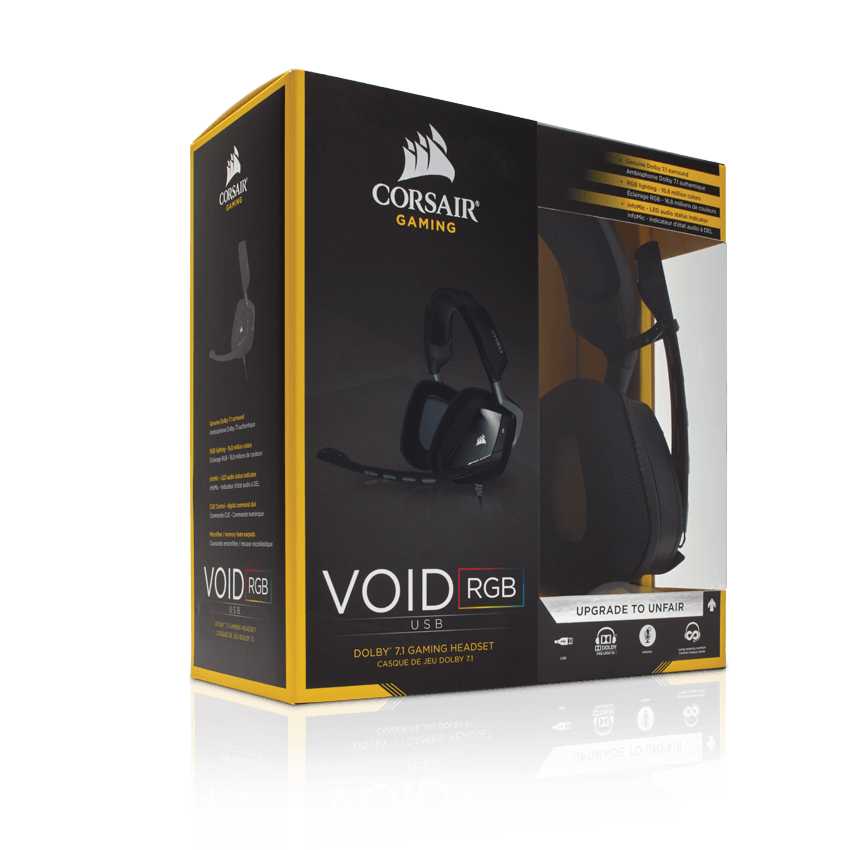 Descripción Sonido que se puede ver Conozca VOID, la innovadora familia de auriculares avanzados de Corsair para juegos. Ya elija sistema de audio inalámbrico, USB o estéreo, siempre estará un paso por delante de sus enemigos. Gracias a un diseño de avance rápido, su espectacular fidelidad y sus innovadoras prestaciones como InfoMic y CUE Control, los auriculares Corsair VOID Gaming le permiten dirigir y controlar el paisaje sonoro de su juego sin dejar de disparar.